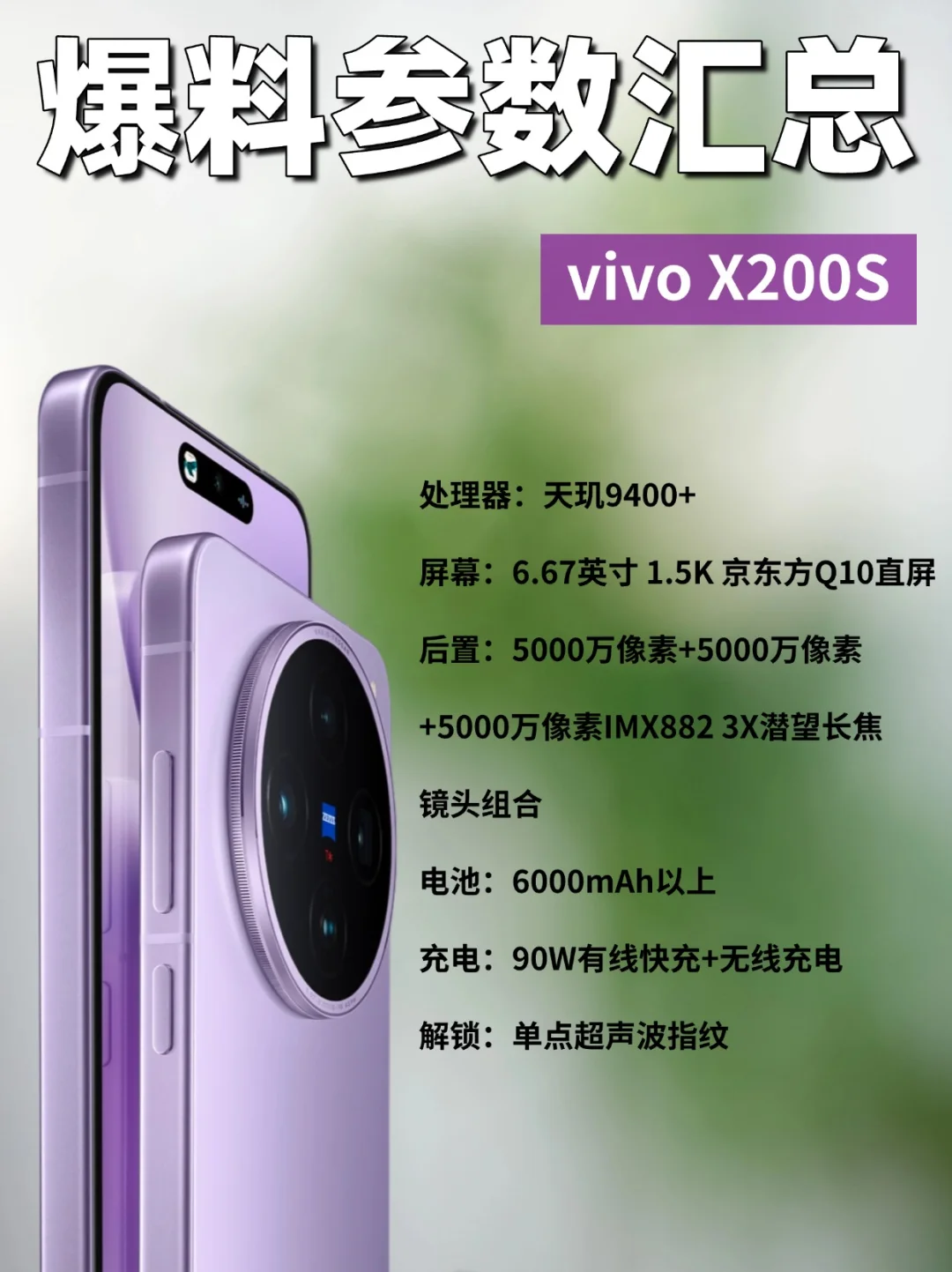 vivo很快会发布一系列新机,包括vivo X200 Ultra、vivo X200s,我自己很长一段时间主力机就是vivo,觉得vivo拍照真的很不错,手感也很好,所以新机还是挺期待的。 这里汇总了一下目前爆料的信息,仅供参考。 - [向右R]vivo X200s 6.67英寸 1.5K 京东方Q10直屏 天玑9400+芯片 单点超声波指纹 3个5000万蔡司三摄,其中一个是3倍潜望长焦,带微距 电池容量6000mAh+ 90W快充,支持无线充电 ~ [向右R]vivo X200Ultra 6.82英寸 2K 京东方等深四曲屏 后置5000万+5000万+2亿像素潜望长焦 支持全焦段4K 120帧视频、全焦段4K 10bit Log 单点超声波指纹 电池6000mAh+ 90W快充,支持无线充电 支持北斗三号短报文 ~ [哇R][哇R] 我最感兴趣的还是超声波指纹,现在的很多手机还是光学指纹解锁,光学指纹解锁的位置很靠下,大屏手机用起来就很不舒服,而且光学指纹解锁的时候还会发出强光,晚上关灯后,解锁的话,简直亮瞎眼,体验非常差。 所以很期待普及超声波指纹,而且vivo这个曝光的超声波指纹录入速度非常快,还可以湿手解锁,指纹的位置也很舒服,对小手党来说真的很友好了,体验可以期待一下。
