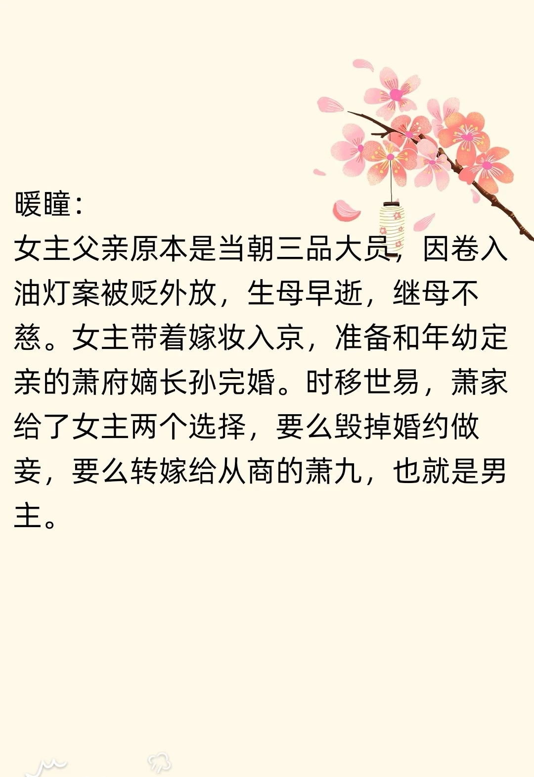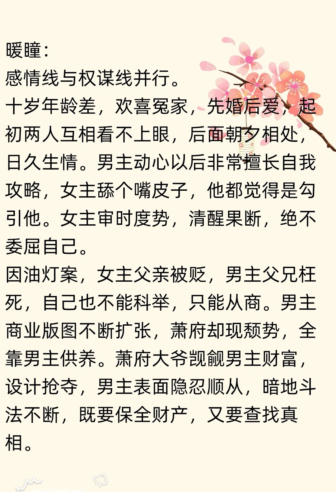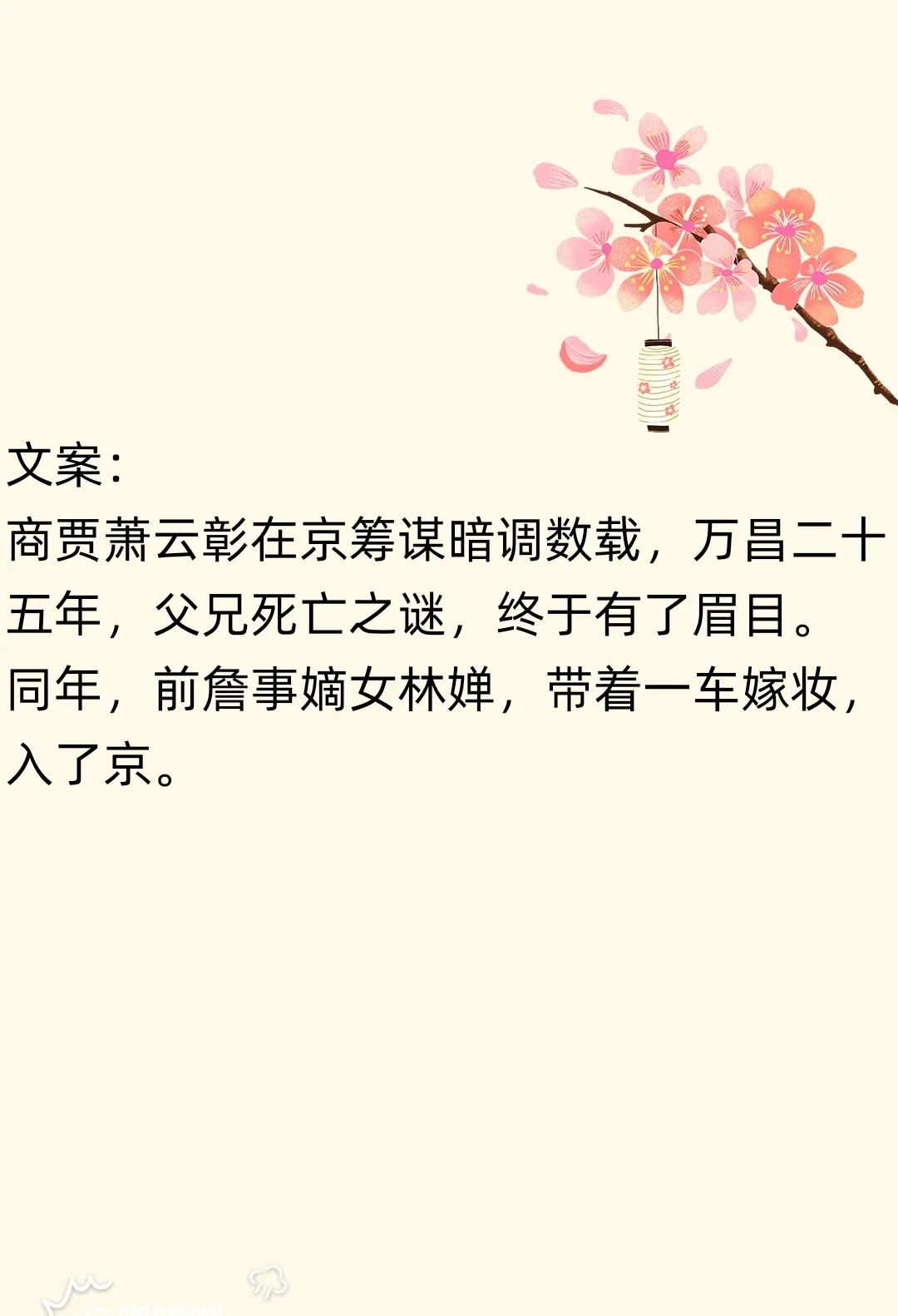 作者:大姑娘 标签:古代言情,先婚后爱,欢喜冤家,年上,权谋 主角:林婵、萧云彰(陈明嘉) 暖瞳: [樱花R]女主父亲原本是当朝三品大员,因卷入油灯案被贬外放,生母早逝,继母不慈。女主带着嫁妆入京,准备和年幼定亲的萧府嫡长孙完婚。时移世易,萧家给了女主两个选择,要么毁掉婚约做妾,要么转嫁给从商的萧九,也就是男主。 [樱花R]感情线与权谋线并行。 十岁年龄差,欢喜冤家,先婚后爱,起初两人互相看不上眼,后面朝夕相处,日久生情。男主动心以后非常擅长自我攻略,女主舔个嘴皮子,他都觉得是勾引他。女主审时度势,清醒果断,绝不委屈自己。 因油灯案,女主父亲被贬,男主父兄枉死,自己也不能科举,只能从商。男主商业版图不断扩张,萧府却现颓势,全靠男主供养。萧府大爷觊觎男主财富,设计抢夺,男主表面隐忍顺从,暗地斗法不断,既要保全财产,又要查找真相。
