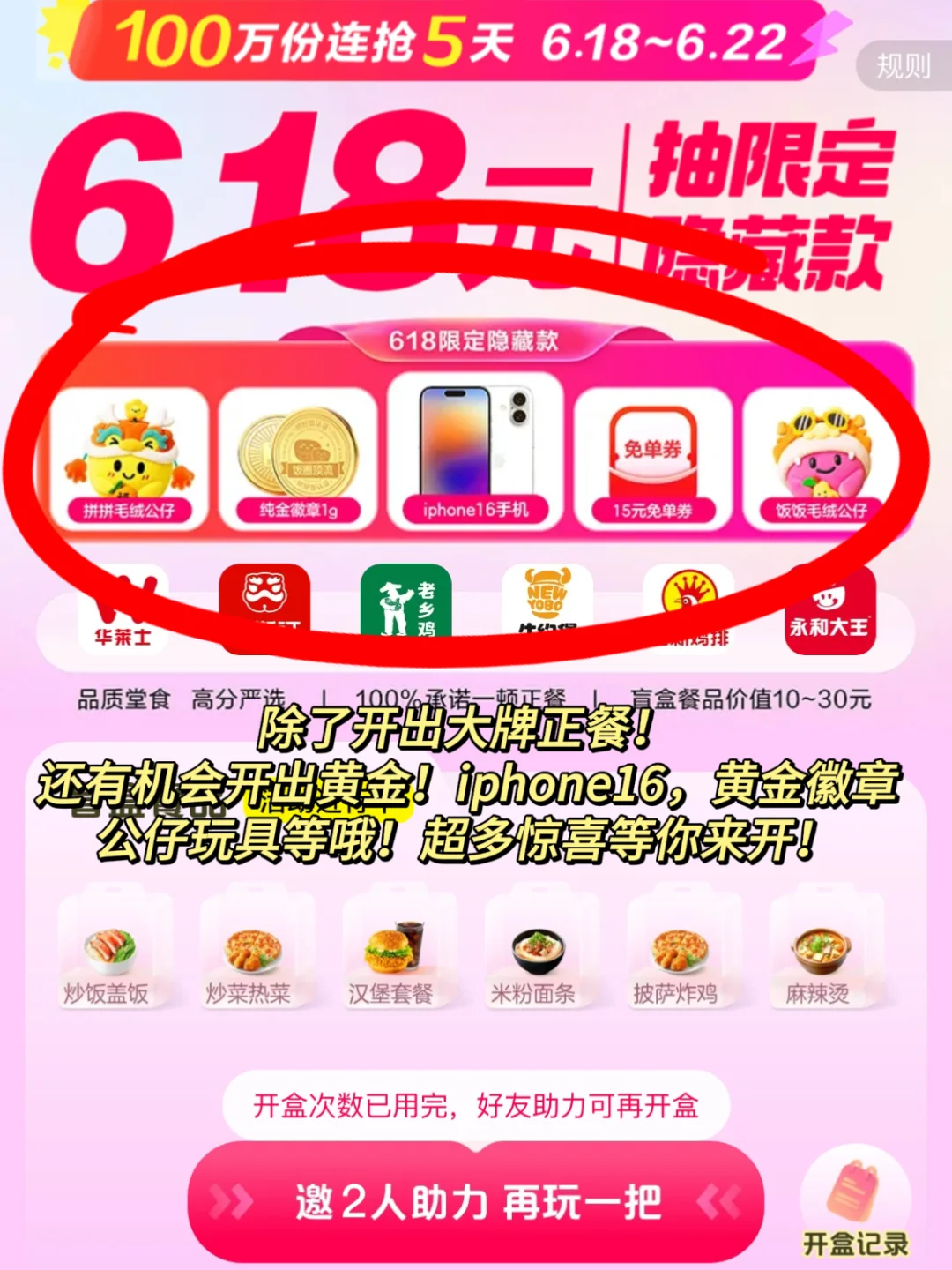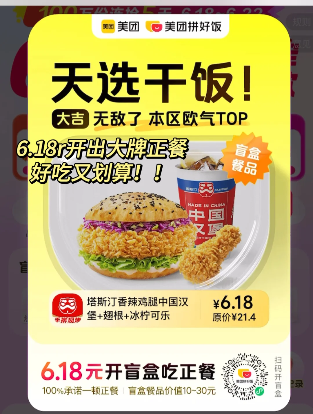 到底谁发明的拼好饭啊!!!也太太给力了吧!! 而且最近还可以抽618盲盒 今天6.18r就解决了一顿午餐! 然后还只花了2.9r又点了一杯蜜雪冰城的棒打鲜橙!! 自从用上了美团拼好饭,真的每天都省下不少钱呢!!😏 6.18-6.22日期间,上美团搜“盲盒01” 6.18r抽盲盒,吃正餐 才6.18r就能解决一顿午餐 这么划算真的太给力啊啊啊!!! 美团拼好饭6.18就能吃到大牌正餐,居然有的开出了华莱士/塔斯汀/煲仔皇/老乡鸡/张亮麻辣烫等大牌!!而且还有机会开出手机/黄金等,最近每天都很期待开盲盒时刻,又好玩又惊喜,天天都有好运!!