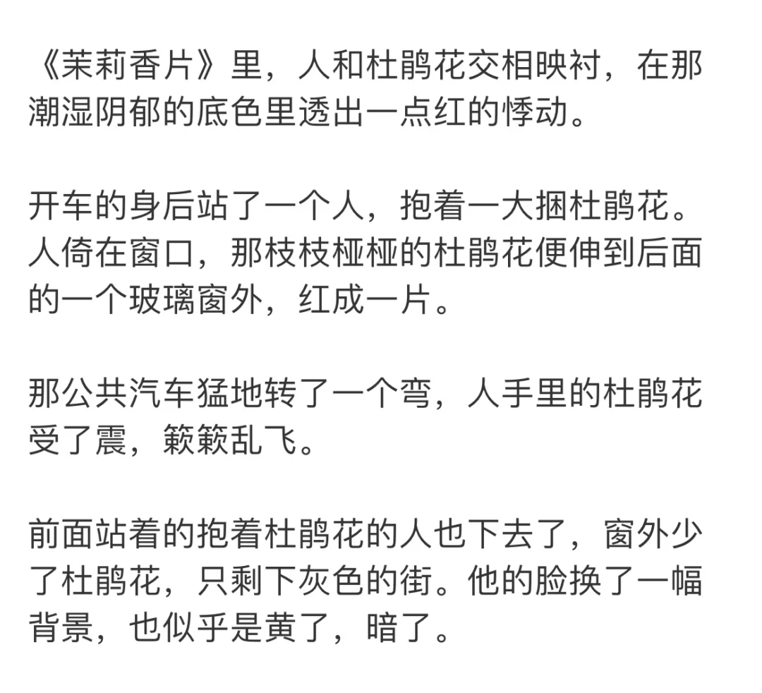 《茉莉香片》里,人和杜鹃花交相映衬,在那潮湿阴郁的底色里透出一点红的悸动。
