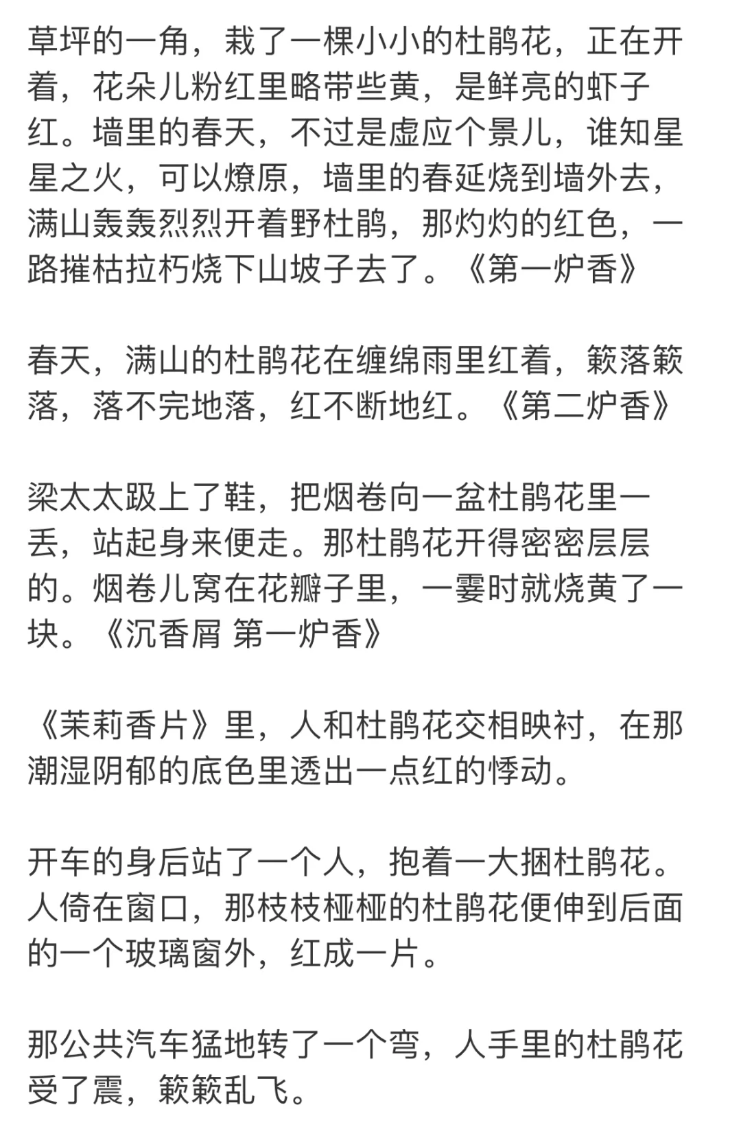 草坪的一角,栽了一棵小小的杜鹃花,正在开着,花朵儿粉红里略带些黄,是鲜亮的虾子红。墙里的春天,不过是虚应个景儿,谁知星星之火,可以燎原,墙里的春延烧到墙外去,满山轰轰烈烈开着野杜鹃,那灼灼的红色,一路摧枯拉朽烧下山坡子去了。《第一炉香》