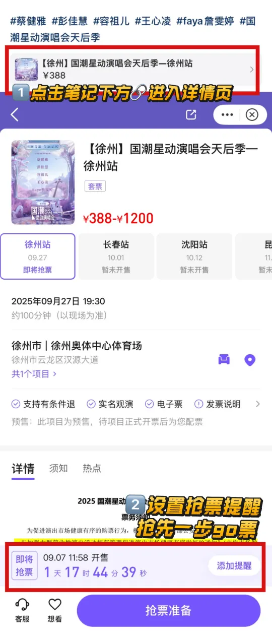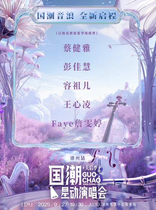 又有神仙演唱会可以冲啦!9.27徐州奥体中心,蔡健雅、容祖儿、彭佳慧、王心凌、詹雯婷同台献唱🎤 9月7日开票,快戳链接提前准备,别错过!
