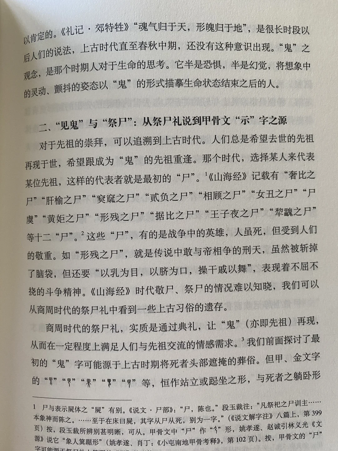 “鬼”的观念起源于新旧石器时代之际埋葬习俗出现时,人们将先祖成为鬼。甲骨文中的“鬼”字源于商周时代的祭尸礼上受祭的“尸”的影响——“鬼”字群摹写的人的头部皆作模糊化处理,是古代葬礼遮盖死者头部之俗的反映