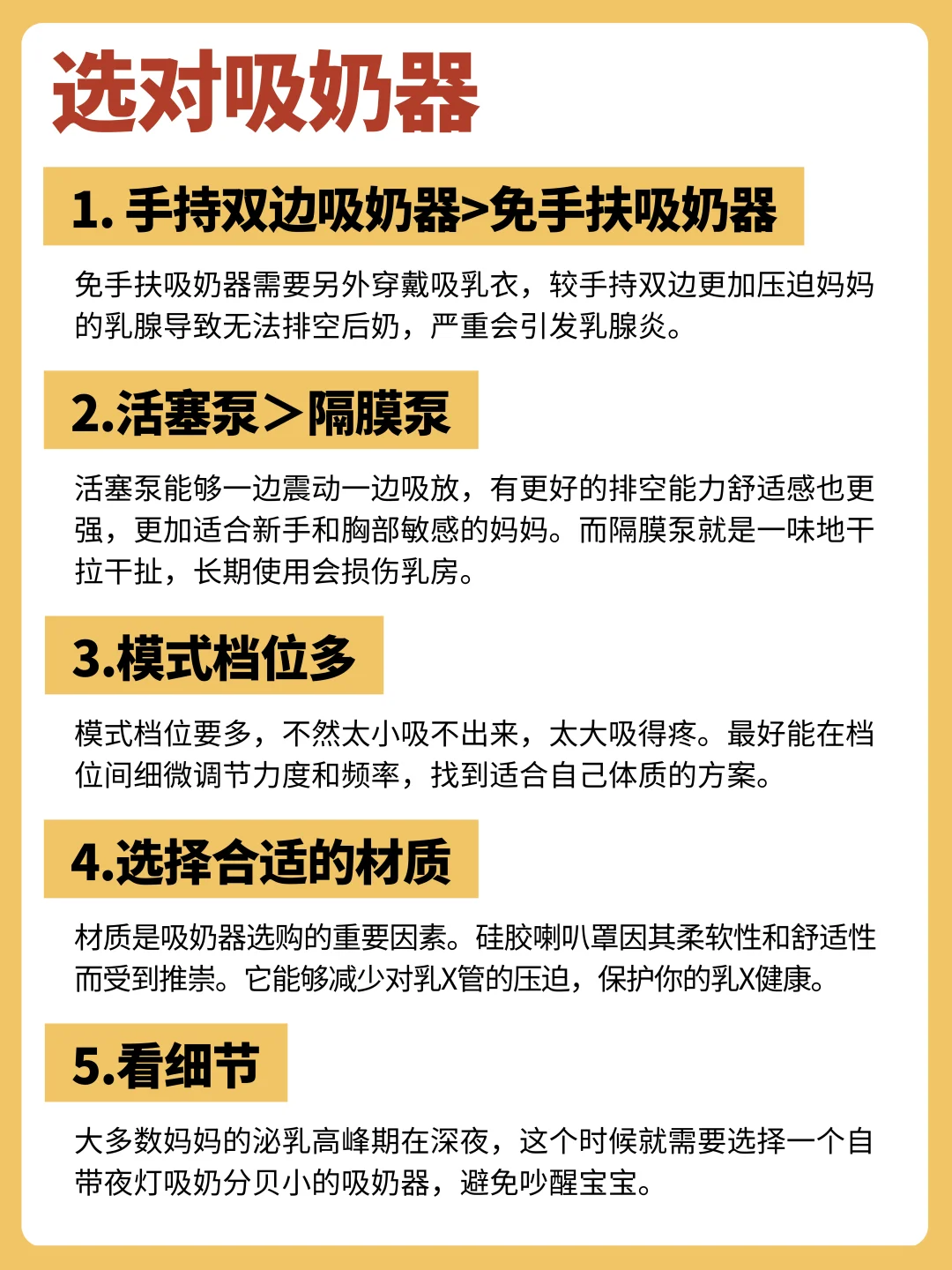 👉🏻吸奶器挑选:手持双边吸奶器>免手扶吸奶器,活塞泵>隔膜泵,选择模式档位多的和喇叭口要软且贴合度高的!