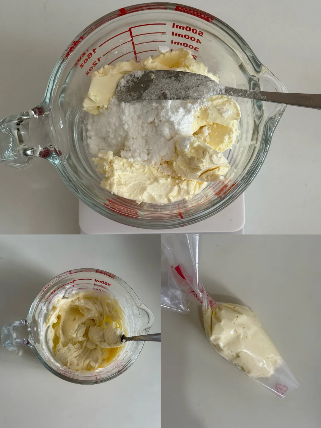 3.混合乳酪和糖粉装裱花袋平均挤6份提前放冰箱冷冻