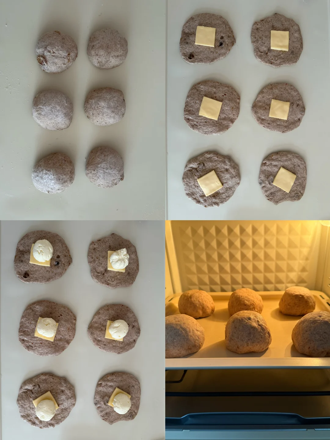 4.面团平均分6份擀开放芝士片和乳酪 收口包圆