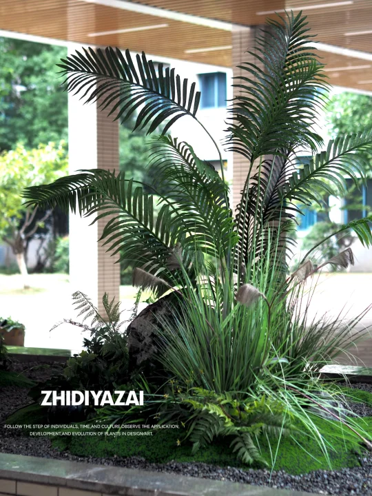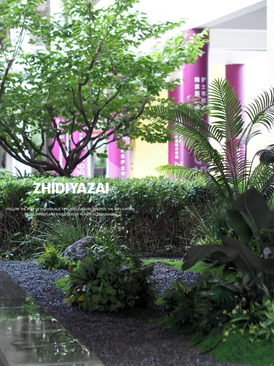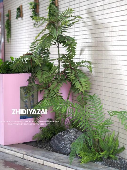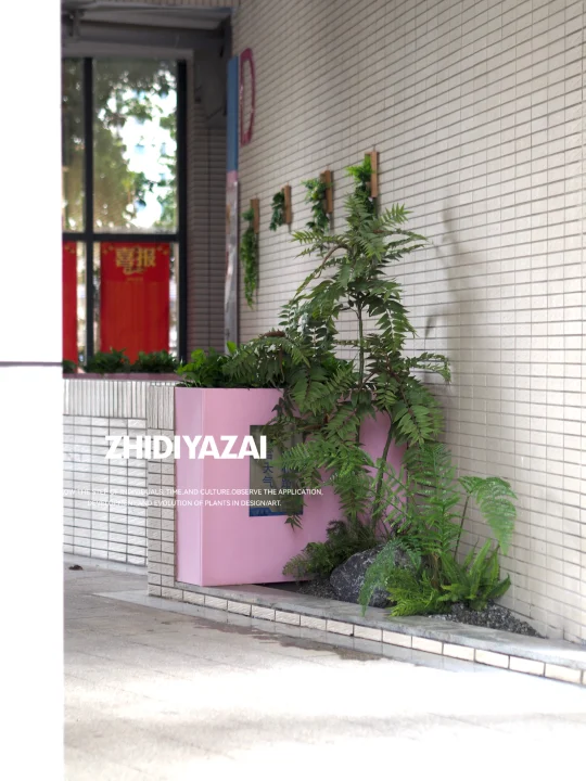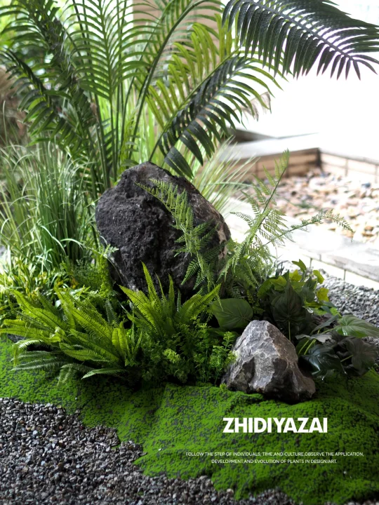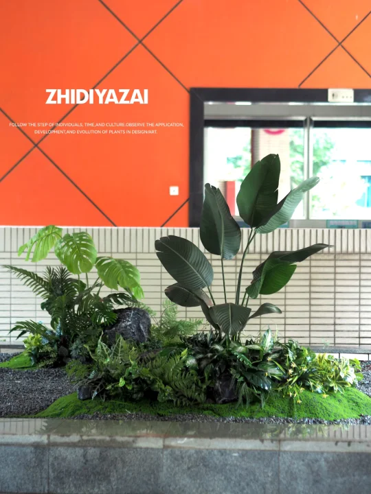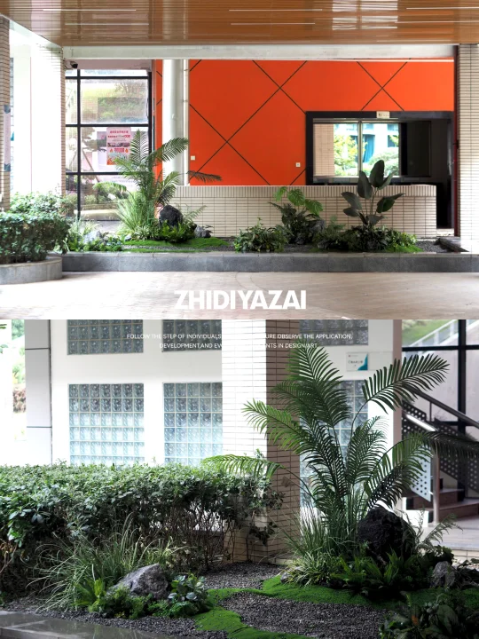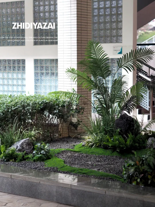 将原有的仿真植物进行排列重组,添置新的植物类型,使得整体景观清爽大气,适当留白也给了空间足够呼吸感。