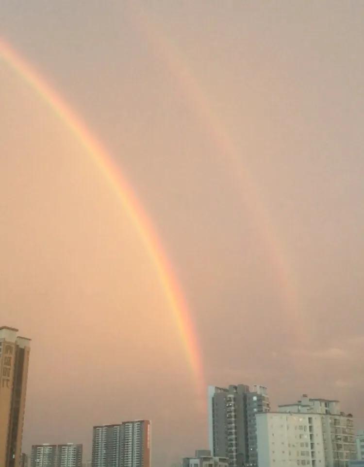 🌦️雨后的湛江傍晚,东边天空竟赠予我们这样的浪漫——双彩虹悄然浮现,一弯明艳,一弯朦胧,宛若仙女的缎带垂落人间。 清晰的那道虹霓如画笔勾勒,另一道则温柔晕染,仿佛天空在轻声诉说两个层次的故事。或许这就是自然的诗意,暴雨洗礼后,终以最绚烂的方式温柔回馈人间。 时光易逝,美好易散,但此刻的惊艳已定格在心。愿你也能看见这片天空的馈赠,无论风雨晴晦,生活总会悄然藏彩🌈 湛江傍晚 雨后天晴 双彩虹