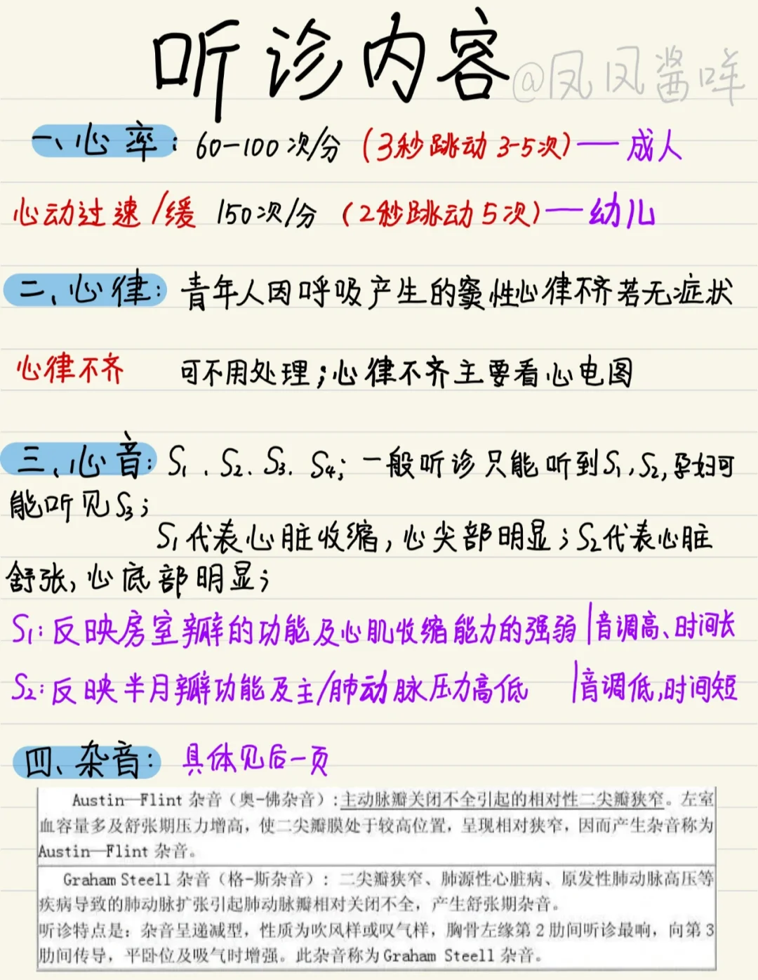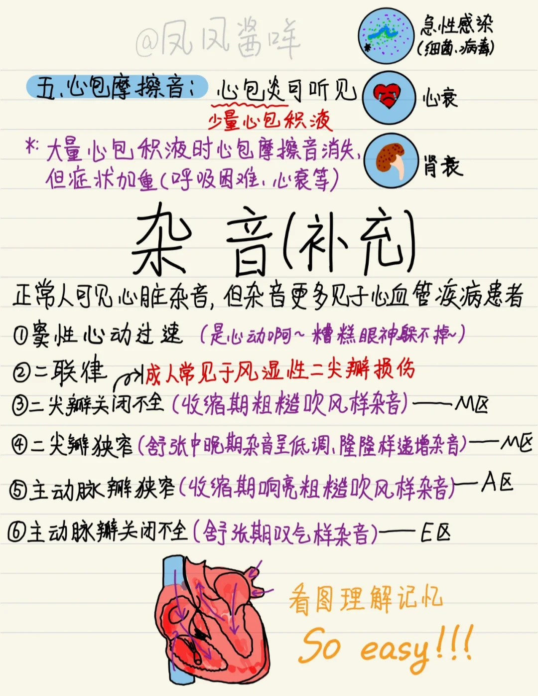 [向右R]心脏听诊难点挺多,需要记忆的东西也很多。 [向右R]整理的时候发现结合图来记忆会变得简单有趣许多。 🐰一:心脏听诊部位,顺序,注意事项 🐰二:心脏听诊内容 🐰三:补充了几个常见的杂音,但是这个没法具体描述,大家可以去破站上找找资源具体听一下就更有意思了 [害羞R]比较喜欢今天的排版,但是也还有进步的空间,大家一起加油! 笔记灵感 医学生笔记