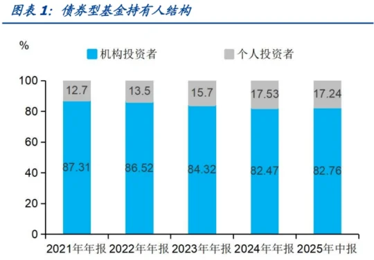 目前债基规模约10.8万亿,从持有者结构来看,债券型基金以机构投资者为主,2025年半年报显示债券基金中个人投资者占比17.2%,机构投资者占比82.8%,机构投资者占比超过八成,是主要的持有力量,如图3。