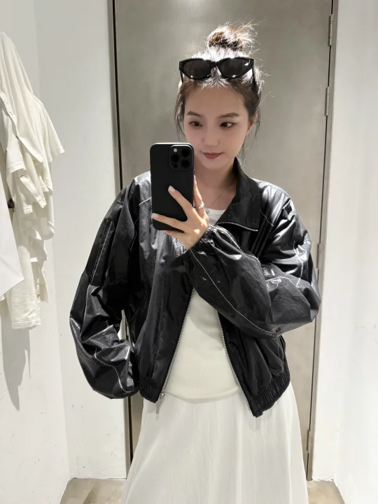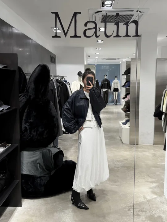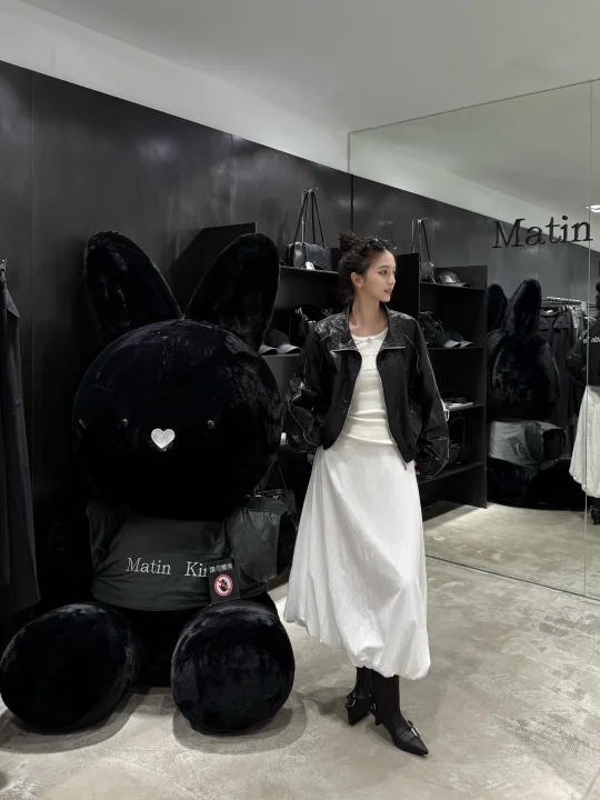 这家新中式茶馆也太会拿捏氛围了!亮面黑外套+黑丝的搭配,又酷又撩,露肩设计刚好中
