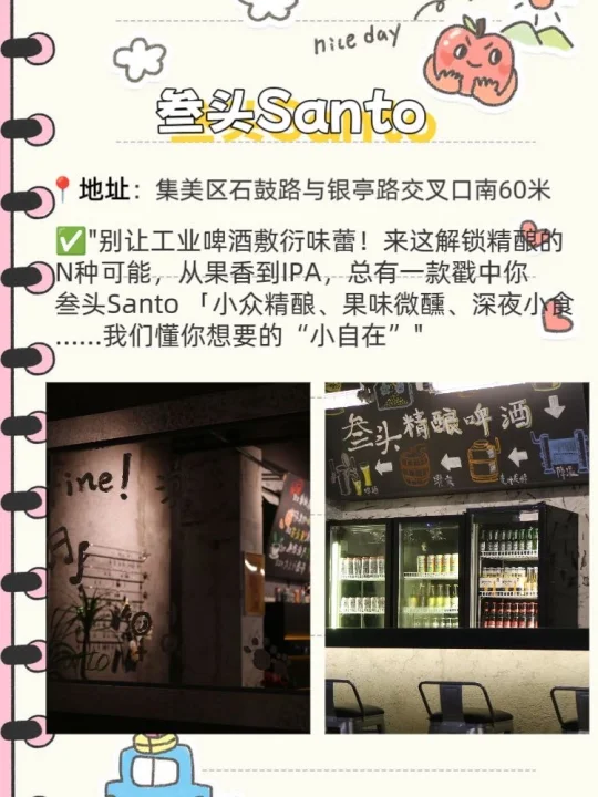 卖点:别让工业啤酒敷衍味蕾!来这解锁精酿的N种可能,从果香到IPA,总有一款戳中你叁头Santo 「小众精酿、果味微醺、深夜小食……我们懂你想要的"小自在"