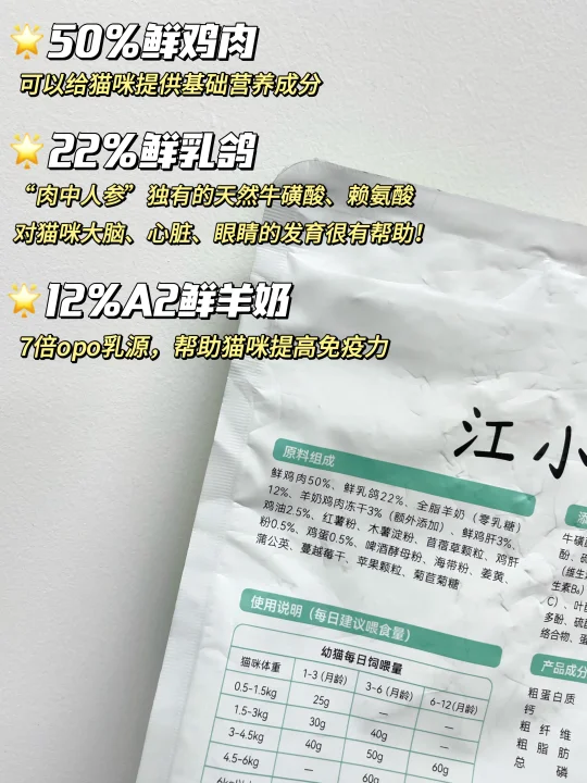 于是我火速入手了江小傲羊奶鲜乳鸽!!之前就听李佳琦说这款是营养进阶的,【50%鲜鸡肉+22%鲜乳鸽+12%鲜羊奶】的营养配方,50%的鲜鸡肉可以给猫咪提供基础营养,22%的鲜乳鸽让营养层层进阶,12%的A2鲜羊奶还能提高猫咪免疫力!看得出来这个营养确实是做到了层层递进。