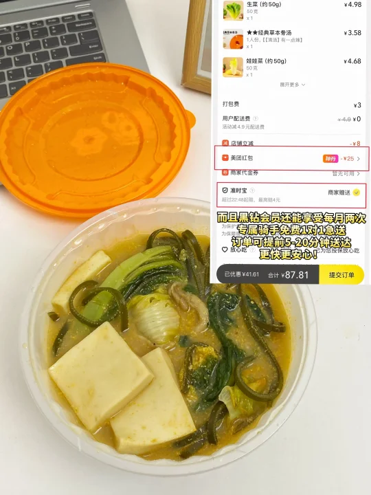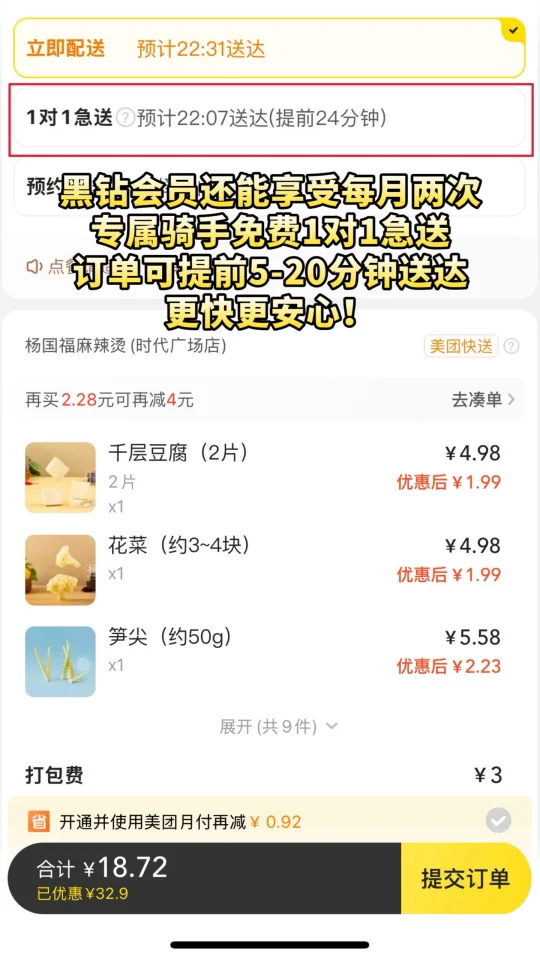 而且黑钻会员还能享受每月两次专属骑手免费1对1急送,订单可提前5-20分钟送达,更快更安心!