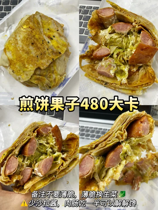 煎饼果子备注不要薄脆换生菜,少沙拉酱也很好吃了,很有味道,可以解解馋!一份约480大卡