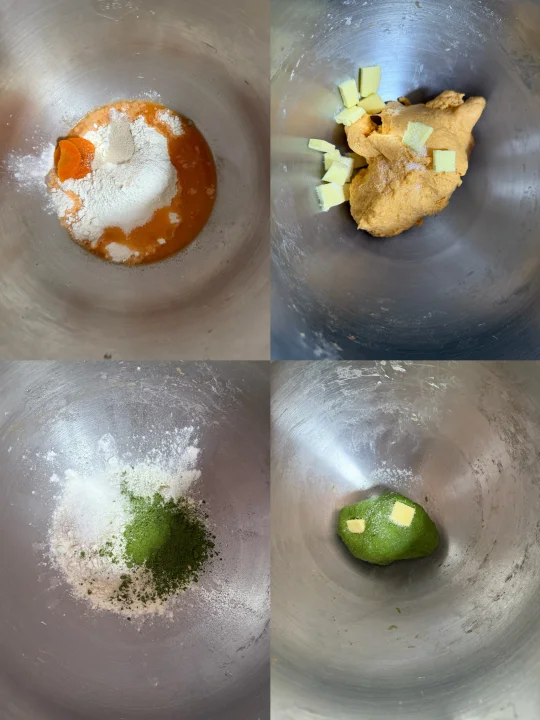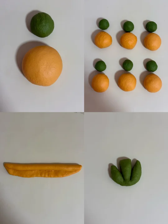 ②两个面团分别平均分成6份 黄色面团擀开卷起搓长螺旋状扭起 绿色面团揉圆切2刀稍微整形后组合