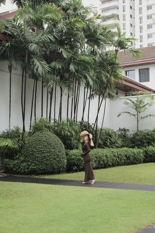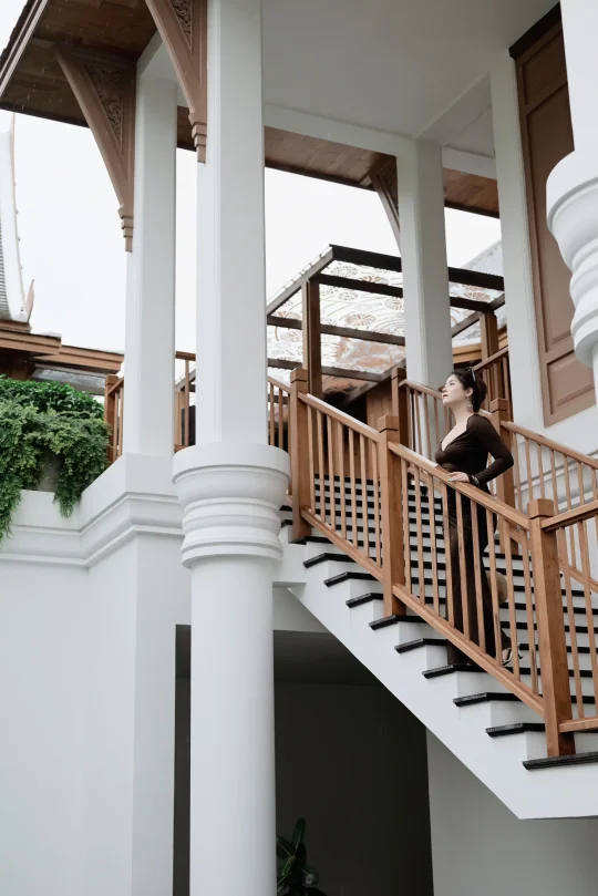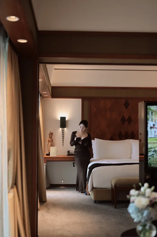房间落地窗前正对庭院💚晨光透过缝隙洒入卧室,泰式木雕与简约线条碰撞出高级感~