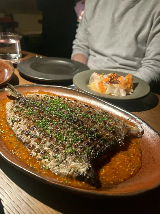这个烤鱼我很推荐,南美洲的做法,sauce是一个番茄味打底的 蛮好吃,鱼皮也是烤的焦香,颜值也在