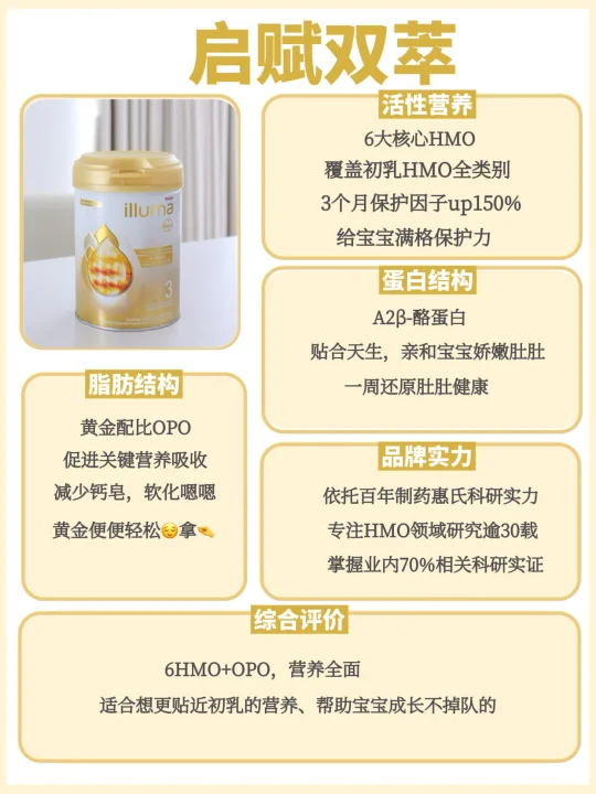 启赋双萃:添加了6种HMO母乳低聚糖,覆盖源乳HMO全类别,含量高种类全,三个月就可以让保护因子up150%,让宝宝拥有结实的小身板