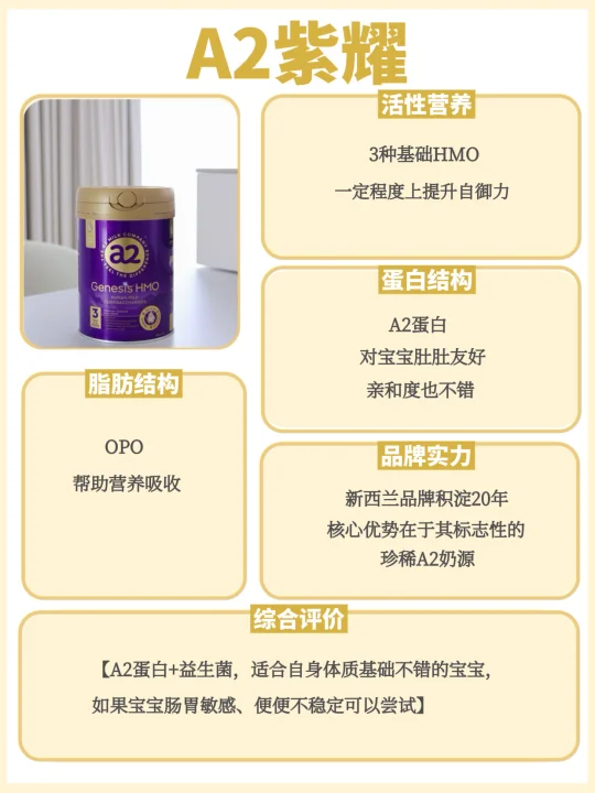 a2紫曜:3种HMO叠加益生菌的组合,能够很好地呵护宝宝的肠道健康,促进消化吸收