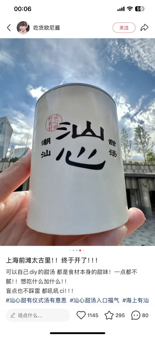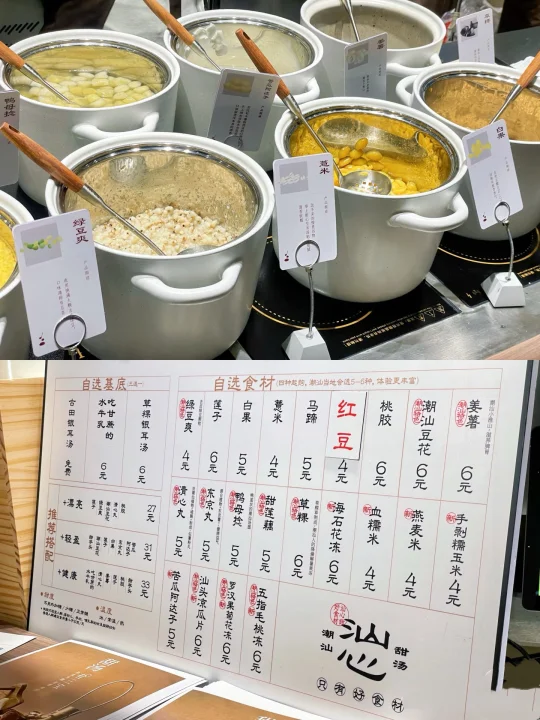 555~我的潮汕毒药👅我心心念念的糖水啊!! 万象城你听到我的呼喊了对不对!!! 潮汕jujujuju好喝的甜汤「汕心」!怒省机票钱! 正儿八经的一碗好甜汤!他家就没有什么花里胡哨的食材,都是「本本分分」的真材实料!!就本着那份慢火细熬的匠心,能不好吃吗!! 每次去!满当当的食材直接给你看,我爱的莲子啊!还🈶红豆、薏米、桃胶!!好奇潮汕鸭母捻是什么味道‼️ 糖水也会“因时而食”变化!!汕心你快开门吧!!