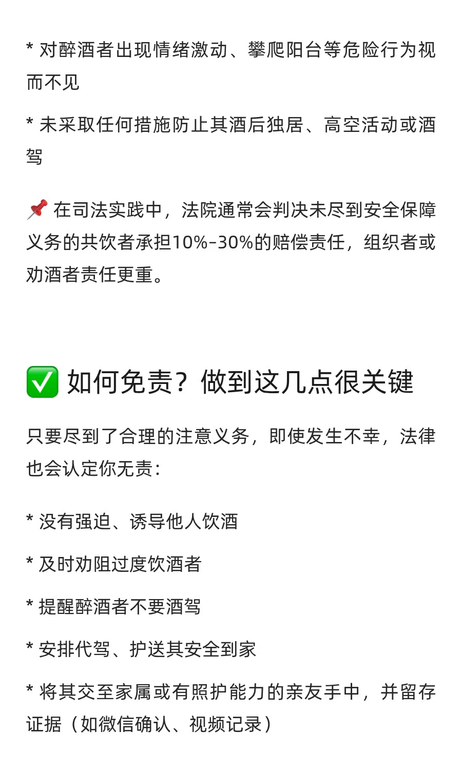 📌 在司法实践中,法院通常会判决未尽到安全保障义务的共饮者承担10%–30%的赔偿责任,组织者或劝酒者责任更重。
