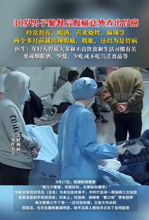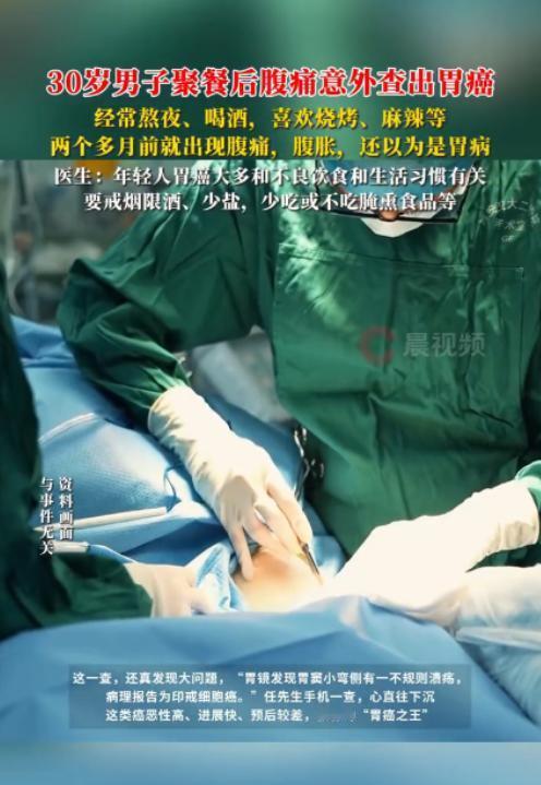 “悲剧还是发生了!”浙江,一男子和朋友聚餐后,肚子又疼又胀,由于这段时间一直这样,男子想着熬过去就行了,但没能拗过家人,还是前往医院检查了,结果被告知患有胃癌!原来,男子经常加班,饮食不规律且喜欢吃辛辣食物,久而久之就出现了问题。网友:年轻人也会得癌? 据媒体9月15日报道,当时30岁的任先生,因胃痛就医,结果被诊断为胃癌,这一消息一度震惊了不少人,特别是年轻人。 很多人心里不禁产生疑问,为什么胃癌会发生在这么年轻的人身上?他究竟怎么就得了这种病? 当时任先生是一家公司的技术骨干,年轻、事业心强,为了给公司做出更大贡献,他常常加班到深夜,几乎没有正常的作息时间,饮食习惯也很不规律,喜欢吃辣的、刺激性的食物,而且经常吃快餐。 长时间的高强度工作加上暴饮暴食,导致了他身体的警报,最初只是肚子偶尔胀痛,他没太在意,以为是压力太大,或者偶尔吃坏了东西,就这样过了几天,但这种不适感并没有随着时间的推移消失,反而越来越严重。 直到有一天,任先生与朋友出去聚餐,吃了顿大餐后,肚子胀得厉害,他本打算再忍一忍,觉得这不算什么大问题,可家人的劝说让他决定去医院检查一下。 没想到检查结果却令他目瞪口呆——胃癌,早期胃癌,任先生甚至不敢相信自己的耳朵,一直以为自己还很年轻,怎么会突然得这种病?然而为了保险起见,他去到另一家医院检查,结果还是一样,医生告知他,必须尽早手术治疗,否则病情可能会进一步恶化。 回想起来,任先生已经有几个月的时间感觉胃部不适,那时候他并没有过于担心,以为是由于加班熬夜太多,导致的消化不良。 于是他便简单地吃了一些胃药,想着时间一长,问题会自己好转,然而这样的“拖延”最终付出了沉重的代价。 任先生的故事,揭示了当今年轻人普遍存在的健康隐患,随着生活节奏的加快和工作压力的增大,越来越多的人开始忽视身体的警告信号。 很多年轻人因为忙碌的工作而没有规律的饮食,甚至连休息时间也被忽略,身体渐渐堆积起了健康问题,像任先生一样,他们往往因为工作或生活的压力而推迟就医,认为小问题可以通过自我调节解决,直到疾病已经变得难以挽回。 这不仅仅是任先生一个人的情况,许多年轻人也在无意识中重复着类似的行为,加班成为常态,暴饮暴食成了日常习惯,许多人忽略了正常的作息和健康饮食,最终让健康问题积重难返。 疾病的发生,常常不是一朝一夕的结果,而是长期不注意身体信号,忽视自我管理的累积后果,现代社会,特别是在大城市中,工作压力很大,很多人为了追求职业上的成功,拼命加班,忽视健康,最终让身体在疲惫中慢慢崩溃。 这种过度的工作模式和不规律的生活方式,尤其是对胃这种消化系统来说,是巨大的负担。 胃癌的发生并非偶然,它是长期不良饮食和生活习惯的积累结果,辛辣食物、油腻食物和不规律的饮食,不仅会刺激胃黏膜,还会增加胃肠道的负担。 加班和熬夜会导致胃部的消化不良和酸碱失衡,长期下来,容易引发胃部疾病,甚至胃癌。 任先生的情况为所有人敲响了警钟:身体不适不能被忽视,不能单纯靠一两颗药丸就解决问题,任何身体上的不适,都应该引起足够的重视,特别是胃部的症状。 如果能早期检查、早期治疗,很多病都能被及时控制,避免发展成严重的疾病,而且任先生的例子也告诉我们,生活不规律、加班成习惯的工作状态,真的不能再继续下去。 虽然努力工作是值得肯定的,但不能忽视了健康的重要性,毕竟工作不是一切,健康才是最重要的资本,年轻人不仅要有追求,更要懂得如何平衡工作与休息,合理安排饮食和生活,避免过度劳累,保护好身体。 我们总是对自己有过度的自信,认为年轻就能抵抗一切,认为健康永远不会离我们而去,但实际上,身体的任何异常都不容忽视,尤其是胃部的变化,一旦出现持续的不适,最好及时去医院检查,而不是通过自我调节或者延误治疗。 通过任先生的故事,大家也应该明白,健康并非理所当然,健康的生活习惯和定期的体检,都是预防大病的有效方法,年轻人要为自己的健康负责,给自己留出休息时间,调整好作息和饮食,才是对未来最好的投资。 对于这件事情,大家有什么看法? 信息来源:《聚餐后腹痛,30岁男子查出胃癌中的“癌王”,这种癌更“青睐”年轻人》潇湘名医