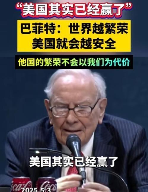 巴菲特称美国已经赢了!根据媒体报道,巴菲特表示,美国事实上已经赢了,我们已经成了举足轻重的国家,从250多年前一穷二白开始,没有什么比这更好的了,我确实认为,他国的繁荣不以美国为代价,那么世界越繁荣,美国越安全,你的孩子也会更安全。 巴菲特的投资哲学接地气,他总说别赌运气,买你懂的生意。伯克希尔不追风口,像苹果卖了些但留大头,银行股也减持,现金储备到3470亿,就为等机会。2024年卖了1340亿股票,主要苹果和美银,防风险。他不爱杠杆,讨厌高负债企业,保险业务是现金牛,GEICO今年扭亏,利润大涨。能源和铁路子公司在手,稳扎稳打。巴菲特看企业像看人,找有护城河的,管理层靠谱的。芒格走后,阿贝尔接棒,专注运营,他退居幕后。这套打法,让伯克希尔年化回报20%,碾压大盘。普通人学他,少投机,多存钱,时间会帮忙。 说起巴菲特的贸易观,得从历史说起。美国从1776年建国,穷得叮当响,靠棉花烟草出口起家,和欧洲亚洲换货,慢慢工业化。十九世纪铁路四通,二十世纪金融科技领跑,现在GDP全球第一,军事实力无人敌。巴菲特在大会上讲,美国赢了,从零到英雄,没啥比这牛。250年跨度,移民潮、两次大战、内战都扛过去,创新驱动,市场开放是关键。他强调,贸易不是零和游戏,各国比优势,合作共赢。关税壁垒像自绑手脚,扰乱供应链,推高物价,美国消费者先遭殃。全球75亿人,你惹恼他们,三亿人自嗨,傻不傻? 巴菲特批评现行政策,没直指谁,但明眼人懂。特朗普时代关税战,他早说过贸易可变武器,但不该这么干。2025年新关税上马,市场抖三抖,股市波动大。巴菲特观点根古典经济学,亚当·斯密分工理论,各干擅长的,饼变大,大家分。他举例,美国卖飞机软件,别人供廉价制造,互补不冲突。封闭门,创新慢,效率低,长远美国吃亏。世界繁荣,美国更安全,孩子未来稳。他这话说白了,就是别当老大欺负人,朋友圈大才牢靠。投资者听了这,得多想想全球布局,别只盯本土。 巴菲特对美国赤字也摇头,支出超收入7%,可持续3%就行。国会官僚多,难改,但他乐观,美国史上最成功国家,潜力足。出生在美国是他运气,机会多,法治好。别听负面噪音,经济韧性强,人均GDP年增2%,25年一家四口多7.6万刀。巴菲特不爱政治,但贸易影响生意,他得说。伯克希尔跨行业,保险赔付、地缘风险都连着全球。关税涨,进口贵,通胀来,企业成本高,利润薄。他建议,平衡贸易,别极端,开放大门,吸外资,推创新。美国赢在包容,移民工程师,硅谷靠这。