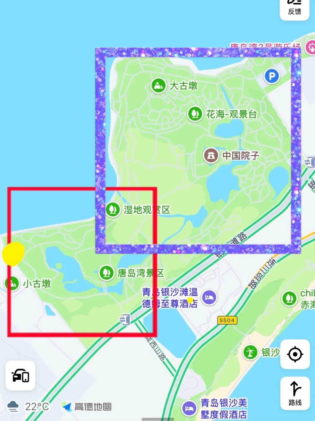在几个小时的观鸟过程中,我只探索了唐岛湾的西侧,如图4所示(红色区域),就已经有了不小收获(还看到一只蒙古兔[黄金薯R]),还有很大一部分区域只能留着以后有机会再去探索了。