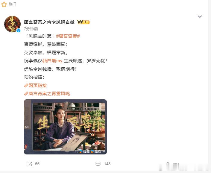白鹿在《唐宫奇案》的生日剧照曝光,剧组同步为她庆生,她还提到接下来行程挺满,三处