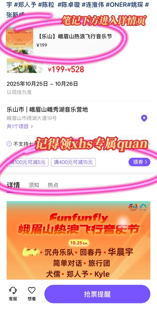 峨眉山热浪飞行音乐节全阵容官宣! 📅10.25-10.26 峨秀湖音乐营地 ✨25日:华晨宇|安溥|回春丹|旅行团 ✨26日:陈粒|陈绮贞|ONER|姚琛|张新成 这是什么神仙搭配!摇滚、民谣、流行全包了~ 乐山终于也有高质量音乐节了🎉 ⏰:9月26日(周五)13:18开抢 👇详情可抢票提醒,抢票还可-15!