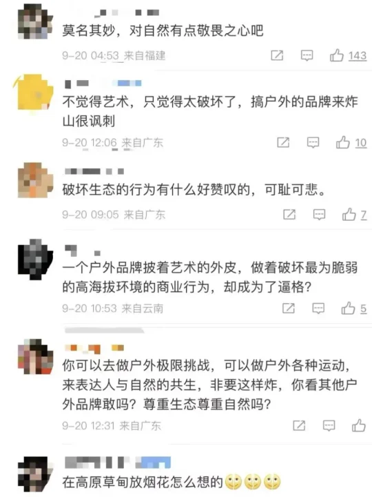 网友:“不觉得艺术,只觉得太破坏了,搞户外的品牌来炸山很讽刺。”[露营R]