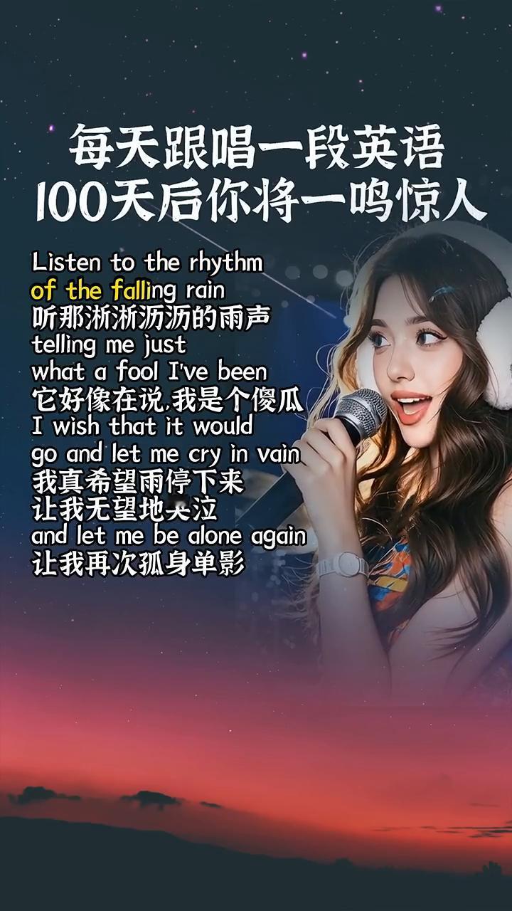 每天跟唱一段英语,100天后你将一鸣惊人。 Listen to the rhythm of the falling rain.听那淅淅沥沥的雨声。 telling me just what a fool I've been.它好像在说,我是个傻瓜。 I wish that it would go and let me cry in vain.我真希望雨停下来,让我无望地哭泣。 and let me be alone again.让我再次孤身单影。