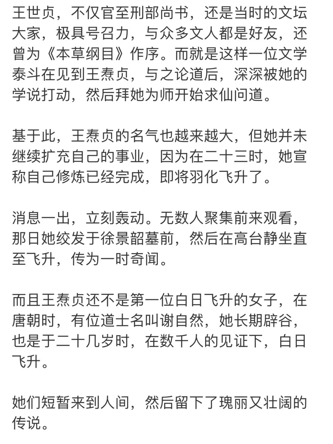 而且王焘贞还不是第一位白日飞升的女子,在唐朝时,有位道士名叫谢自然,她长期辟谷,也是于二十几岁时,在数千人的见证下,白日飞升。