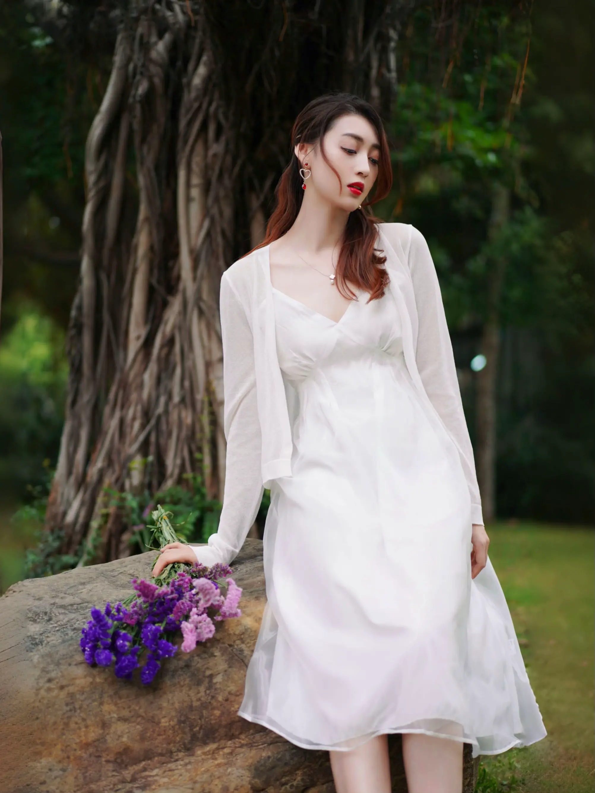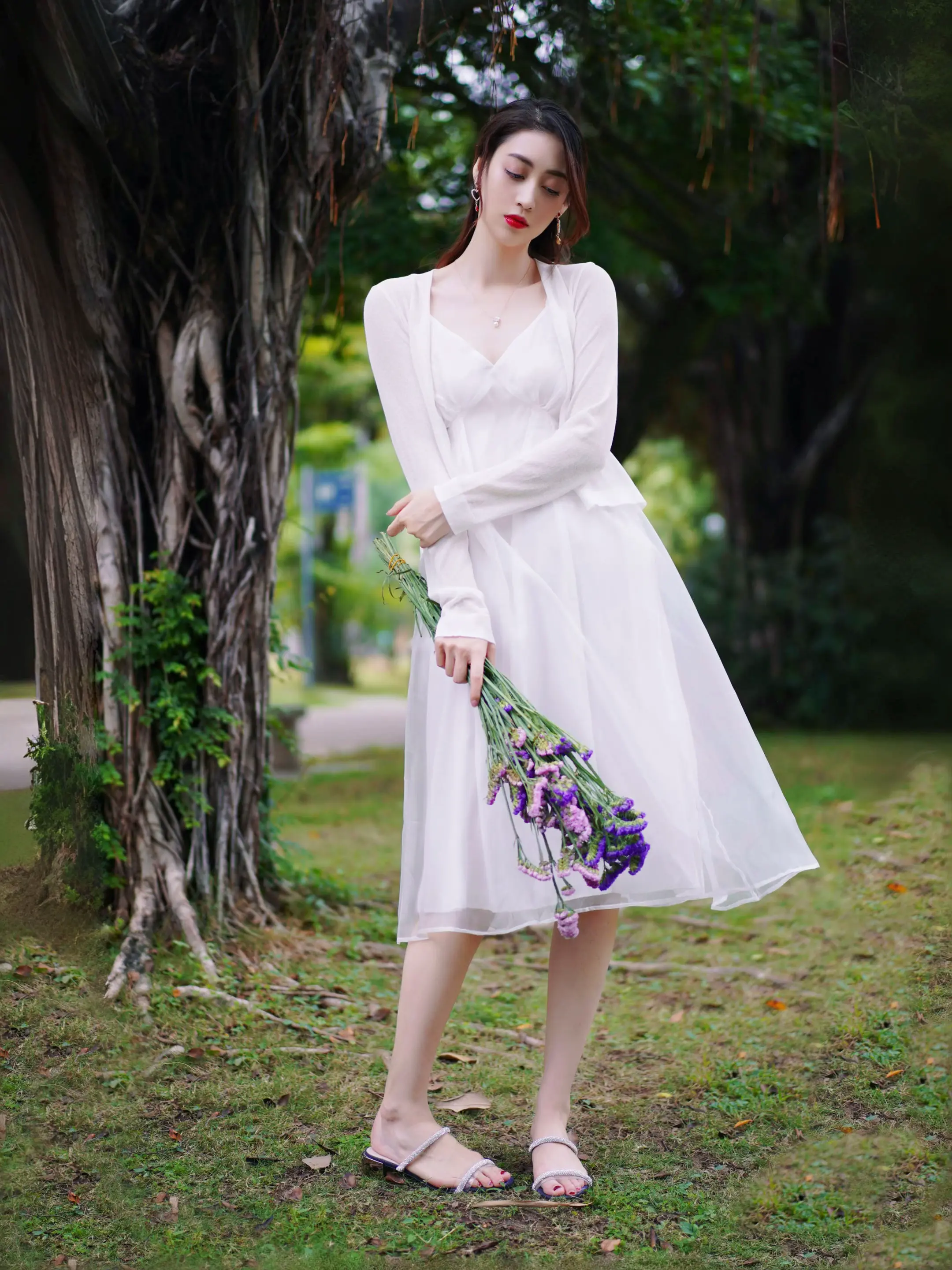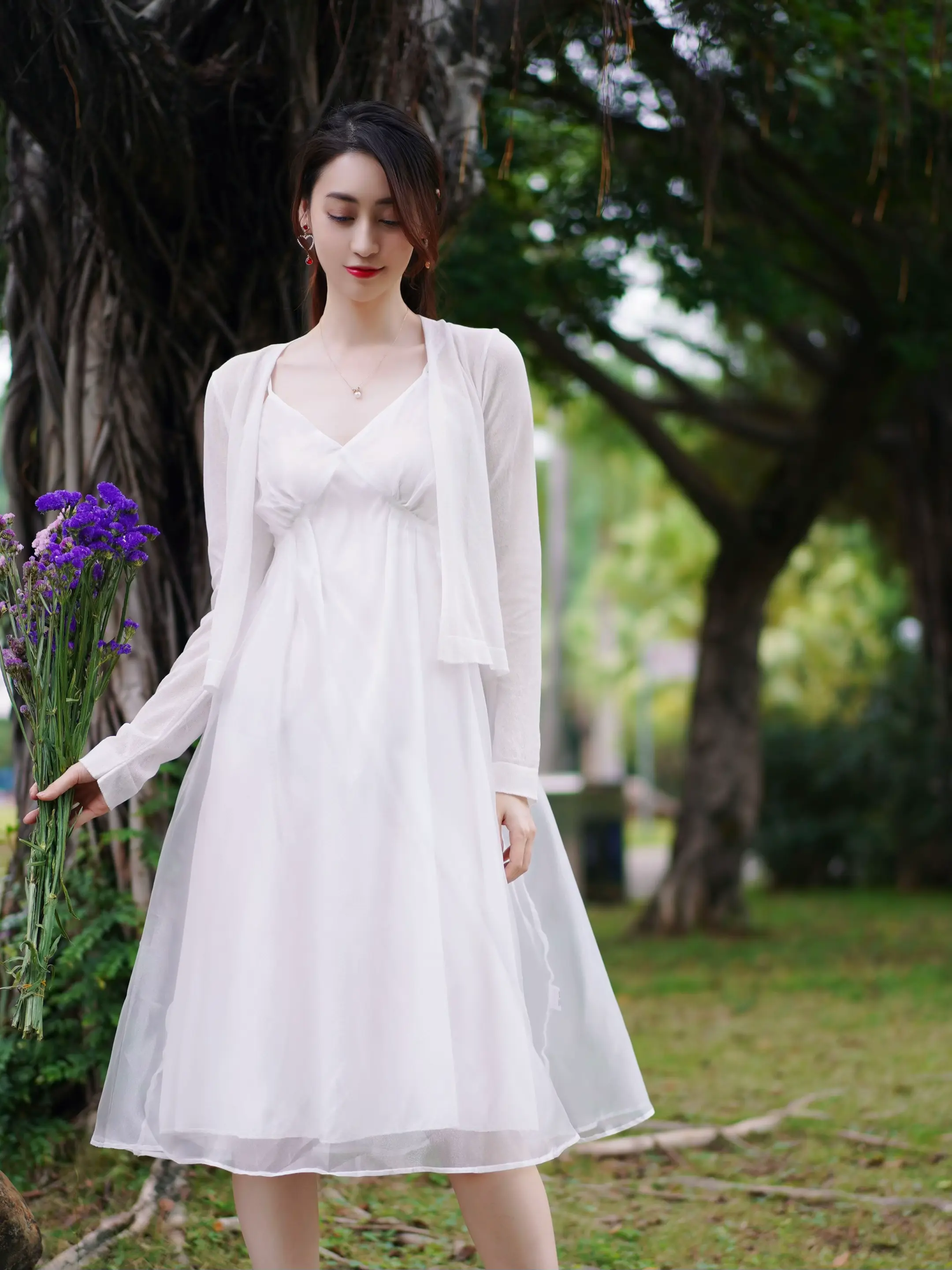 温柔纯白开启🔛秋日松弛感。一套纯白开启🔛我的秋天🍂 温温柔柔的针织小开衫 流光缎面的白纱吊带裙 简约气质的松弛感秋日穿搭 公园榕树下漫步很出片 带上一束小花道具 坐着 站着 都很优雅 秋日也能拍出仙气飘飘照片