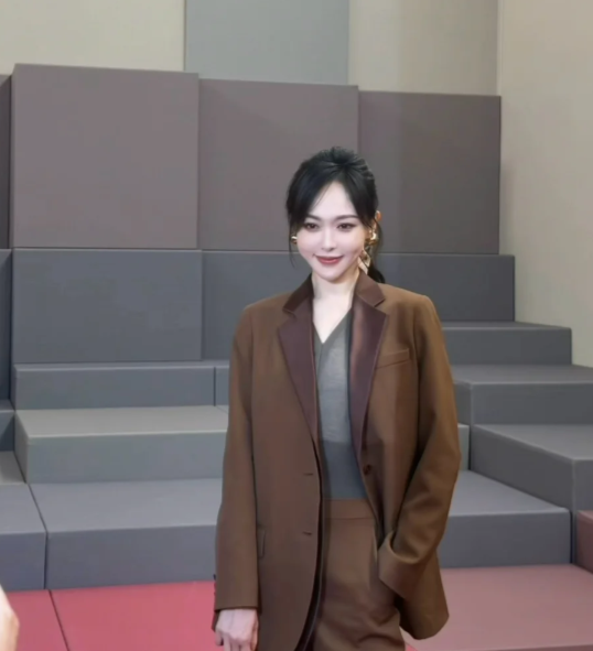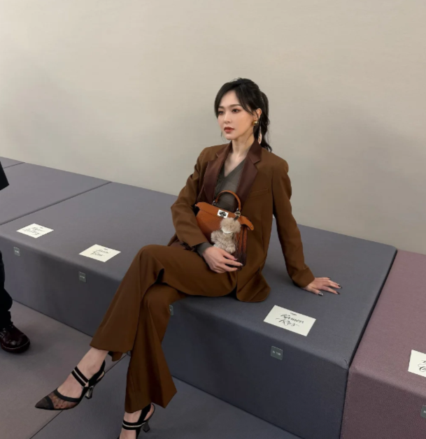 米兰时装周Fendi秀场新路透释出,唐嫣身穿品牌美拉德色系套装,剪裁简约利落,面