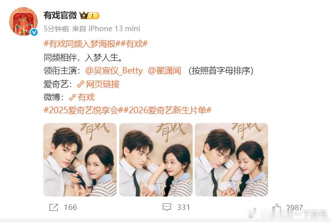 《有戏》推出吴宣仪翟潇闻双人海报,两人同频相伴的状态在海报中很吸睛,独特的物料设