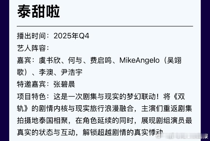 《双轨》团综与虞书欣新剧团综均待Q4开播,两档综艺同步推出显独特,对节目里展
