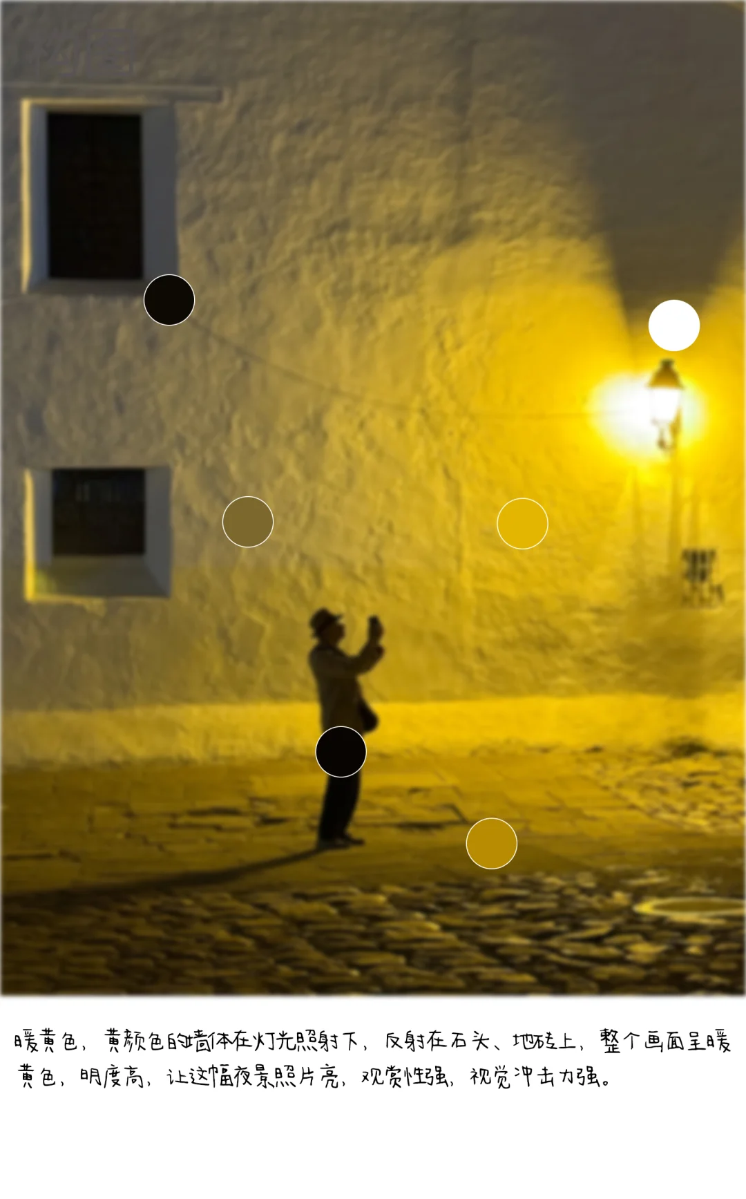 4.色彩:暖黄色,黄颜色的墙体在灯光照射下,反射在石头、地砖上,整个画面呈暖黄色,明度高,让这幅夜景照片亮,观赏性强,视觉冲击力强