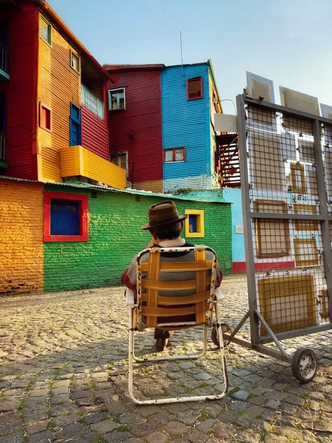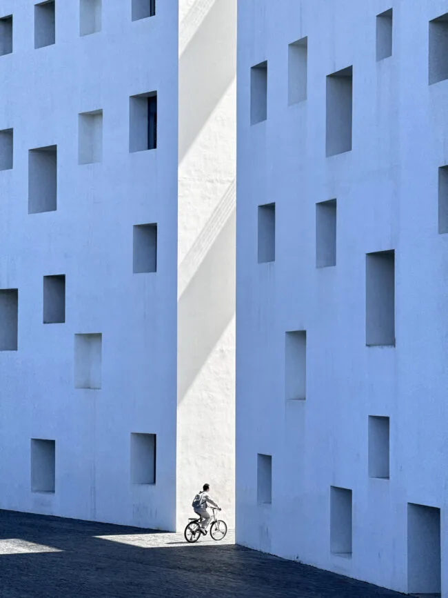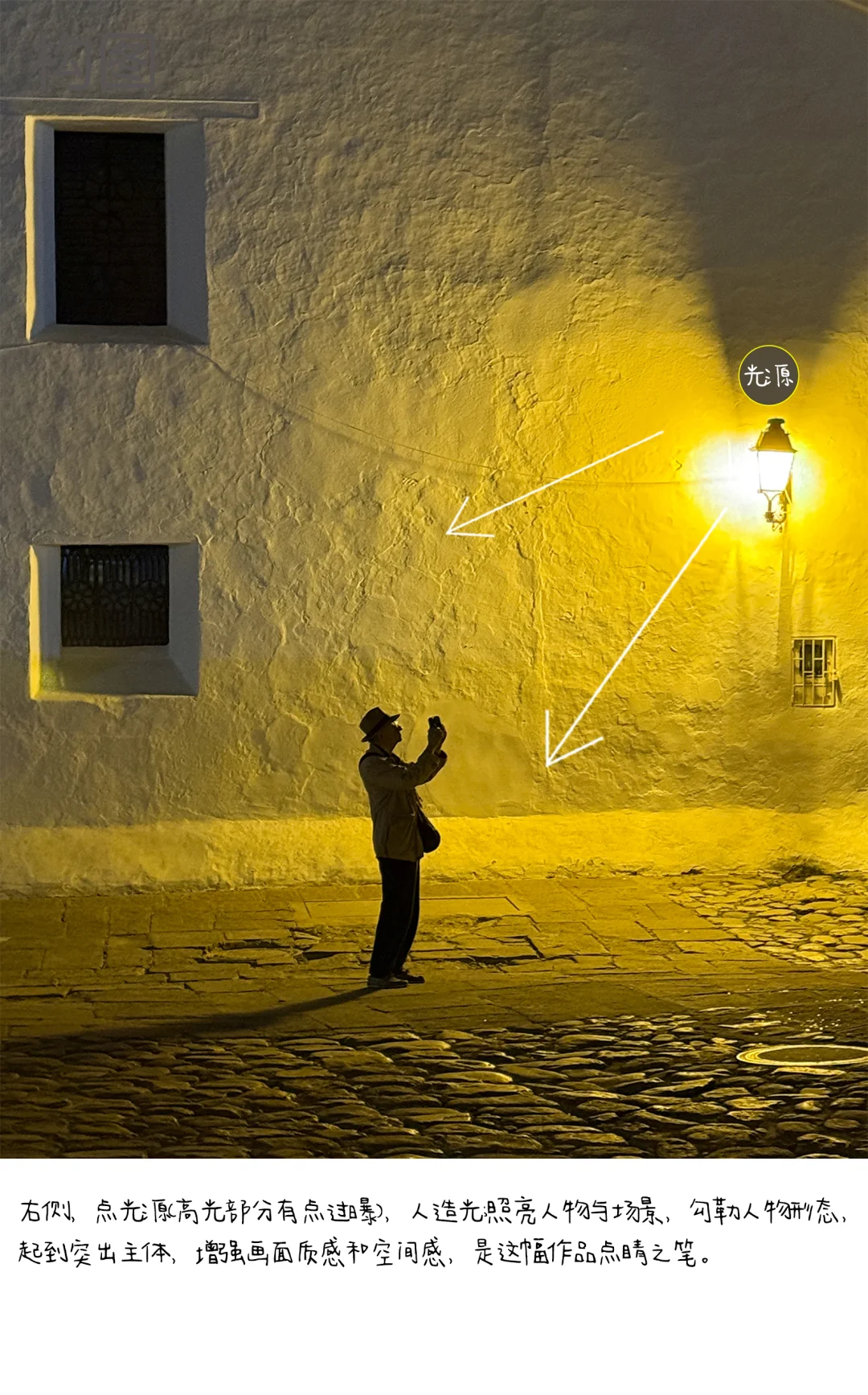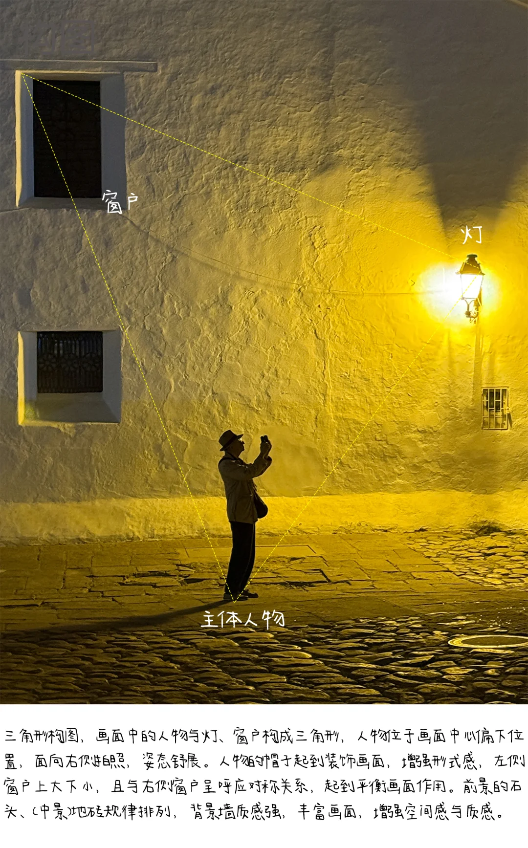 1.构图:三角形构图,画面中的人物与灯、窗户构成三角形,人物位于画面中心偏下位置,面向右侧拍照,姿态舒展。人物的帽子起到装饰画面,增强形式感,左侧窗户上大下小,且与右侧窗户呈呼应对称关系,起到平衡画面作用。前景的石头、(中景)地砖规律排列,背景墙质感强,丰富画面,增强空间感与质感