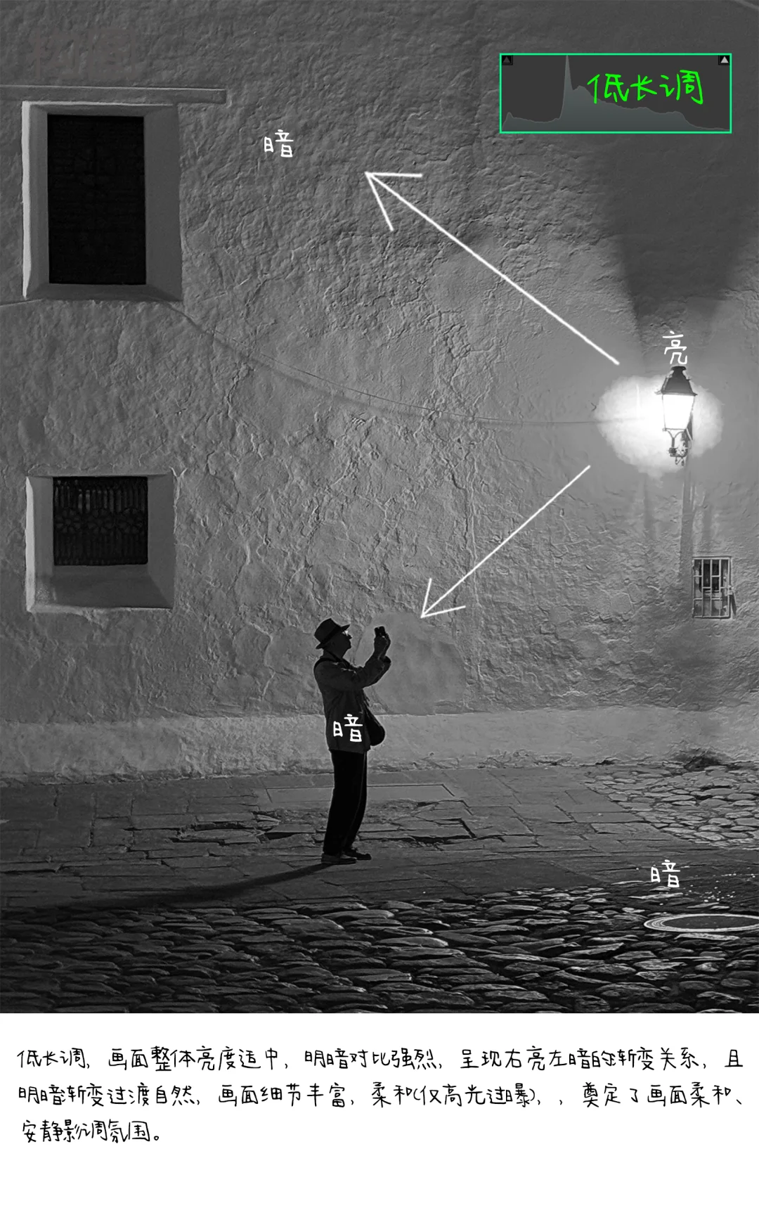 3.影调:低长调,画面整体亮度适中,明暗对比强烈,呈现右亮左暗的渐变关系,且明暗渐变过渡自然,画面细节丰富,柔和(仅高光过曝),奠定了画面柔和、安静影调氛围