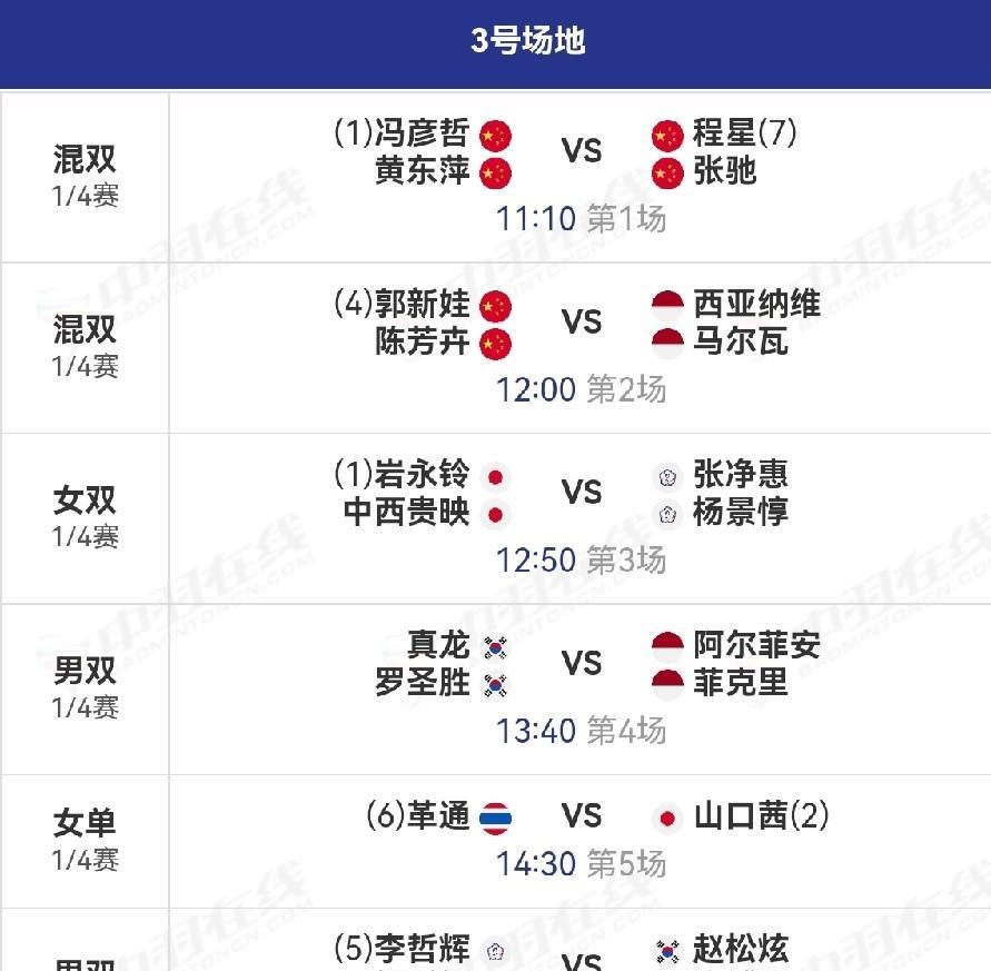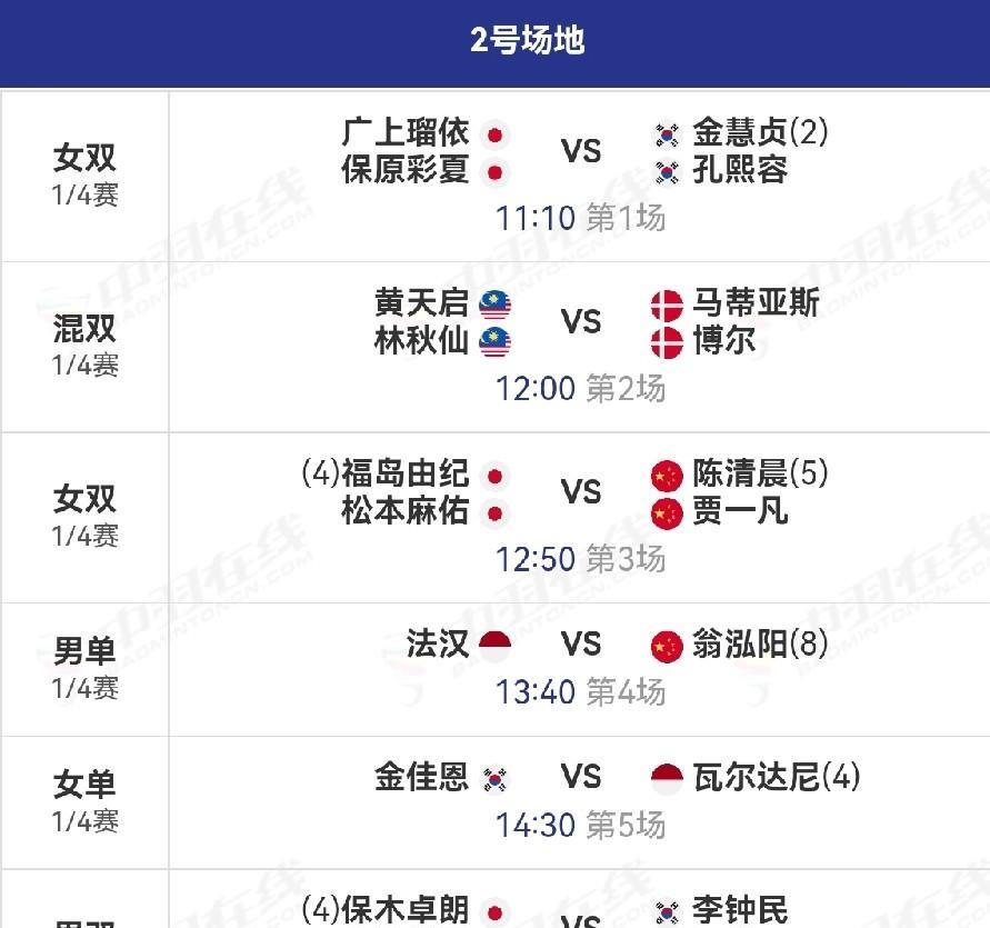2025年韩国羽毛球公开赛1/4赛,翁泓阳对阵法汉,任翔宇/谢浩南对阵金元浩/徐承宰,陈清晨/贾一凡对阵福岛由纪/松本麻佑,冯彦哲/黄东萍对阵程星/张驰,郭新娃/陈芳卉对阵西亚纳维/马尔瓦,蒋振邦/魏雅欣对阵吴埙阀/赖洁敏。