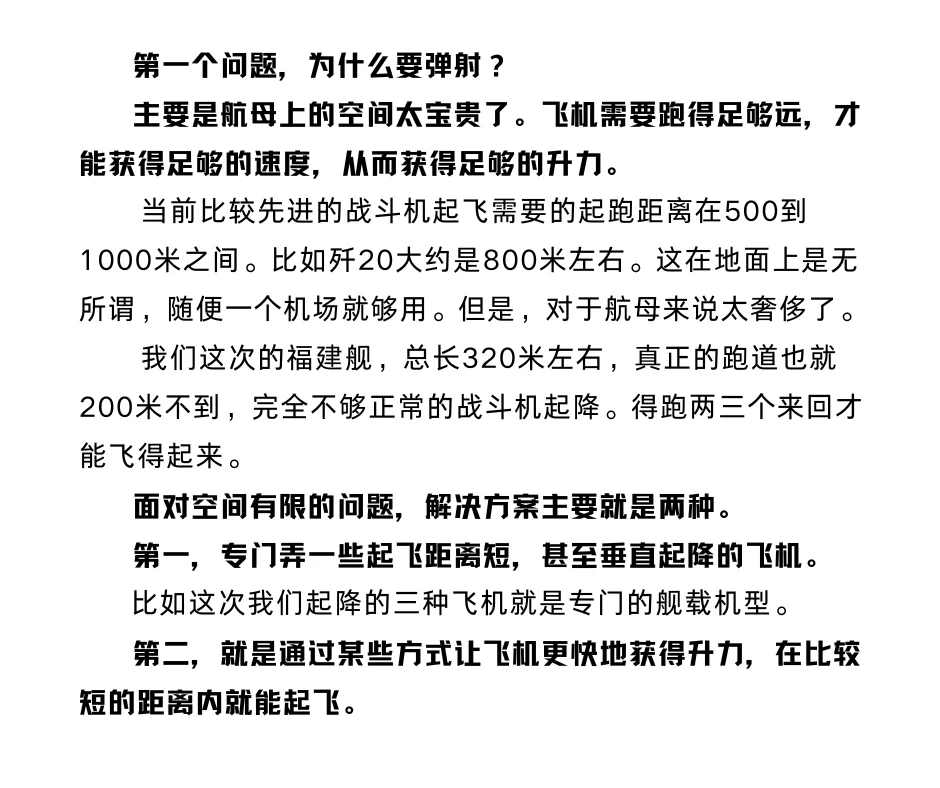 第一,为什么要弹射?主要是航母上的空间太宝贵了。飞机需要跑得足够远,才能获得足够的升力。