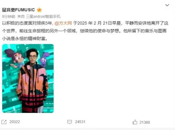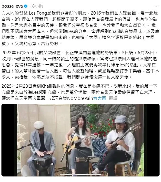 “2025年2月28日看到方大同离世的消息,实在是心痛不已,对我来说,我的第一下心痛是来自于为Les感到心痛,也是万分惋惜,两位音乐天使最终停留了在大理。愿您们在天堂再次重聚一起玩音乐NoMorePain。”