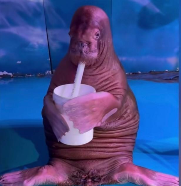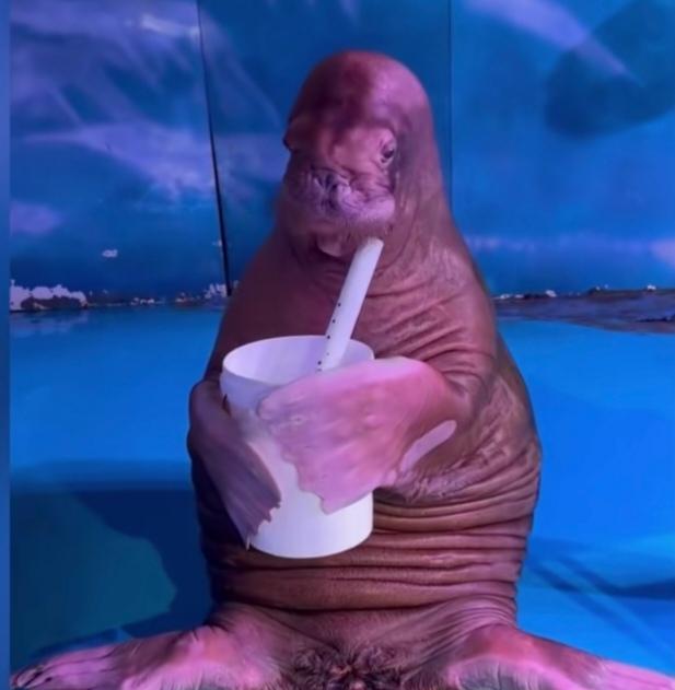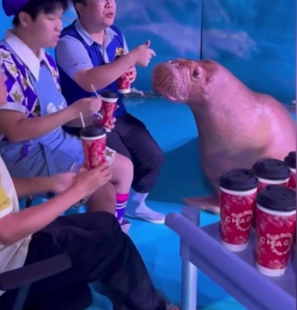 别看海象长的呆头呆脑,它的智商可不低,一个海洋馆里几名饲养员休息时,坐在海象面前喝奶茶,没想到海象眼睛直勾勾的望着饲养员手上的奶茶,并时不时的凑上去嗅嗅,频繁暗示饲养员它也想喝。[捂脸]