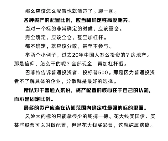 最多的资产应当在认知范围内确定性最强的标的里。风险大的标的拿很少的钱搏。花大钱买国债、买某些股票可以叫做配置,但是花大钱买彩票,这就纯属瞎搞。