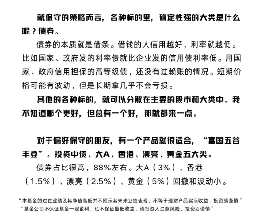 [火R]对于偏保守的朋友,“富国五谷丰登”就很适合。投资中债、大A、香港、漂亮、黄金五大类。