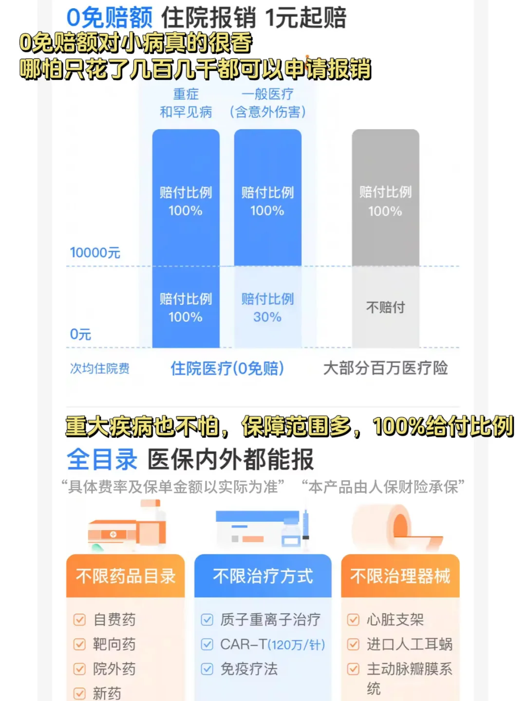 保障范围多,不仅包括一般医疗,连100种重大疾病和23种罕见病,质子重离子也覆盖,医保内外都能报,对于外院药(含癌症特药)只要是由药监局批准且在国内上市的均可保,无清单限制,不限药品目录包含自费药,靶向药,院外药,新药,不限治疗方式包含质子重离子治疗,CAR-T(120万/针),免疫疗法,不限治疗器械包含心脏支架,进口人工耳蜗,主动脉瓣膜系统。医疗保障全面又安心。