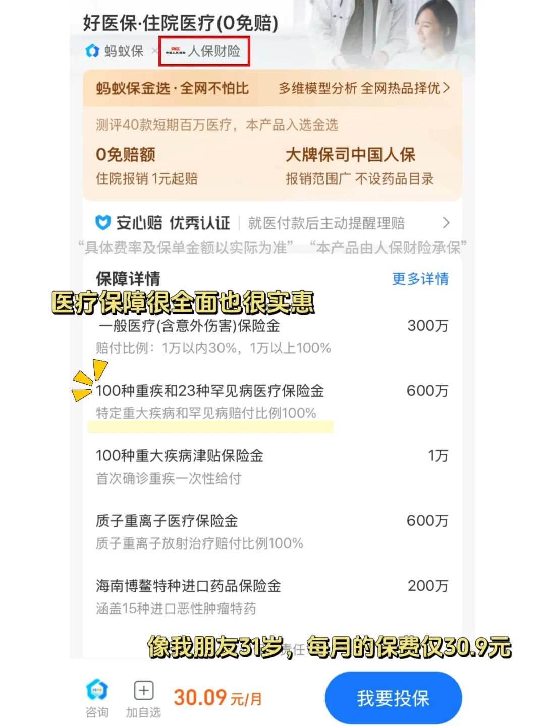 它的性价比高,1个月几十块钱就行,像我朋友31岁,每月的保费是30.09元。但是却能拥有年累计赔付总限额600w