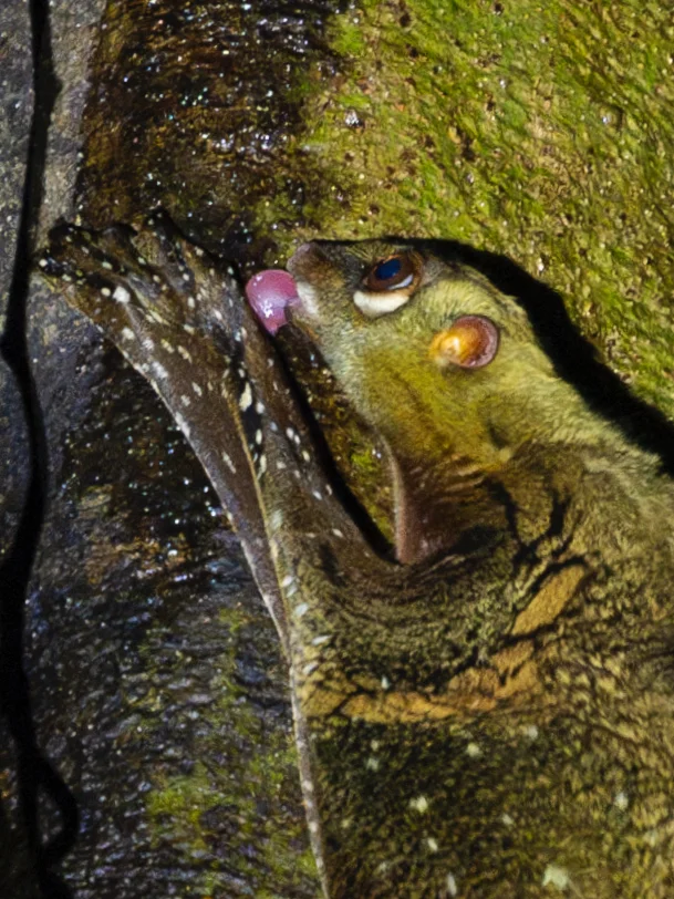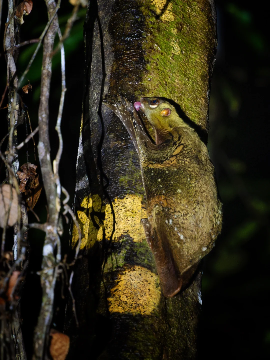 马来鼯猴名字里也有猴,但它们可不是灵长类,宽大的皮翼让它们成为雨林中最会滑翔的飞行员,画面中这只鼯猴在舔食这树上渗出的汁液,这其实也是蜂猴喜欢的食物。优秀的保护色让它们很容易和树干融为一体,在哺乳动物身上看到绿色系也是不容易,上一个还是长绿毛的树懒。